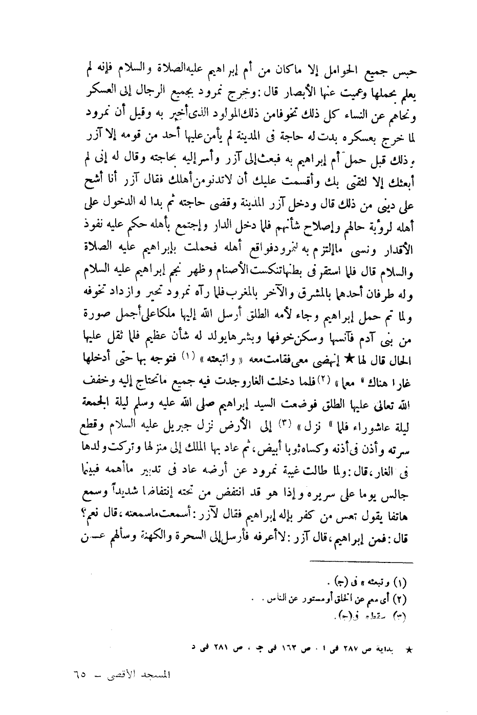 حبس جميع الحوامل إلا ما كان من أم إبراهيم عليه الصلاة والسلام؛ فإنه لم يعلم بحملها وعميت عنها الأبصار قال: وخرج نمرود بجميع الرجال إلى العسكر ونحاهم عن النساء كل ذلك تخوفًا من ذلك المولود الذي أخبر به وقيل: إن نمرود لما خرج بعسكره بدت له حاجة في المدينة لم يأمن عليها أحد من قومه إلا آزر، وذلك قبل حمل أم إبراهيم به فبعث إلى آزر وأسر إليه بحاجته وقال له: إني لم أبعثك إلا لثقتى بك، وأقسمت عليك أن لا تدنو من أهلك فقال آزر: أنا أشح على ديني من ذلك قال: ودخل آزر المدينة وقضى حاجته، ثم بدا له الدخول على أهله لرؤية حالهم وإصلاح شأنهم فلما دخل الدار واجتمع بأهله حكم عليه نفوذ الأقدار ونسي ما التزم به للنمرود فواقع أهله فحملت بإبراهيم -عليه السلام- قال: فلما استقر في بطنها تنكست الأصنام وظهر نجم إبراهيم -عليه السلام- له طرفان أحدهما بالمشرق والآخر بالمغرب فلما رآه نمرود تحير وازداد تخوفه، ولما تم حمل إبراهيم وجاء لأمه الطلق أرسل اللَّه إليها ملكًا على أجمل صورة من بني آدم فآنسها وسكن خوفها وبشرها بولد له شأن عظيم فلما ثقل عليها الحال قال لها: انهضي معي فقامت معه واتبعته فتوجه بها حتى أدخلها غارا هناك معما فلما دخلت الغار وجدت فيه جميع ما تحتاج إليه وخفف اللَّه تعالى عليها الطلق فوضعت السيد إبراهيم -صلى اللَّه عليه وسلم- ليلة الجمعة ليلة عاشوراء فلما نزل إلى