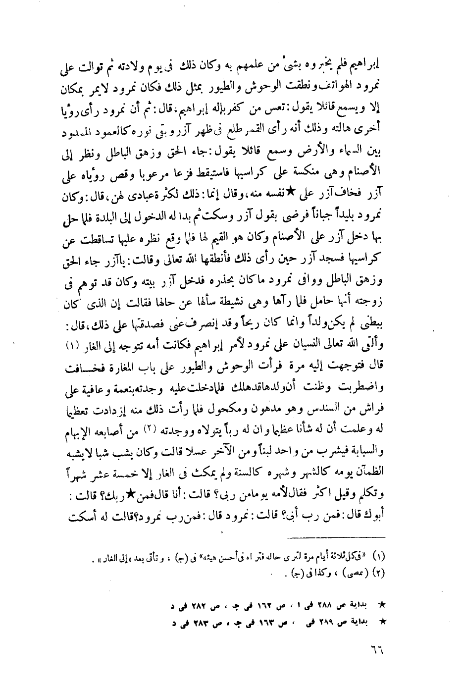 إبراهيم فلم يخبروه بشيء من علمهم به وكان ذلك في يوم ولادته ثم توالت على نمرود الهواتف ونطقت الوحوش والطيور بمثل ذلك فكان نمرود لا يمر بمكان إلا ويسمع قائلًا يقول تعس من كفر بإله إبراهيم، قال: ثم إن نمرود رأى رؤية أخرى هالته وذلك أنه رأى القمر طلع في ظهر آزر وبقي نوره كالعمود الممدود بين السماء والأرض وسمع قائلًا يقول: جاء الحق وزهق الباطل ونظر إلى الأصنام وهي منكسة على كراسيها فاستيقظ فزعا مرعوبًا وقص رؤياه على آزر فخاف آزر على نفسه منه، وقال إنما: ذلك لكثرة عبادتي لهن، قال: وكان النمرود بليدًا جبانًا فرضي بقول آزر وسكت ثم بدا له الدخول إلى البلدة فلما حل بها دخل آزر على الأصنام وكان هو القيم لها فلما وقع نظره عليها تساقطت عن كراسيها فسجد آزر حين رأى ذلك فأنطقها اللَّه تعالى وقالت: يا آزر جاء الحق وزهق الباطل ووافى نمرود ما كان يحذره، فدخل آزر بيته وكان قد توهم في زوجته أنها حامل؛ فلما رآها وهي نشيطة سألها عن حالها فقالت: إن الذي كان ببطنى لم يكن ولدًا وإنما كان ريحًا وقد انصرف عنى فصدقها على ذلك، قال: وألقى اللَّه تعالى النسيان على نمرود لأمر إبراهيم فكانت أمه تتوجه إلى الغار قال: فتوجهت إليه مرة فرأت الوحوش والطيور على باب المغارة فخافت واضطربت وظنت أن ولدها قد هلك فلما دخلت عليه وجدته بنعمة وعافية على فراش من السندس وهو مدهون ومكحول فلما رأت ذلك منه ازدادت تعظيمًا له وعلمت أن له شأنًا عظيمًا وأن له ربًا يتولاه ووجدته من أصابعه الإبهام والسبابة فيشرب من واحد لبنًا ومن الآخر عسلًا قالت: وكان يشب شبًا لا يشبه الظمآن، يومه كالشهر وشهره كالسنة ولم يمكث في الغار إلا خمسة عشر شهرًا وتكلم، وقيل أكثر فقال لأمه يومًا: من ربي؟ قالت: أنا، قال: فمن ربك؟ قالت: أبوك، قال: فمن رب أبي؟ قالت: نمرود. قال: فمن رب نمرود؟ قالت له: اسكت