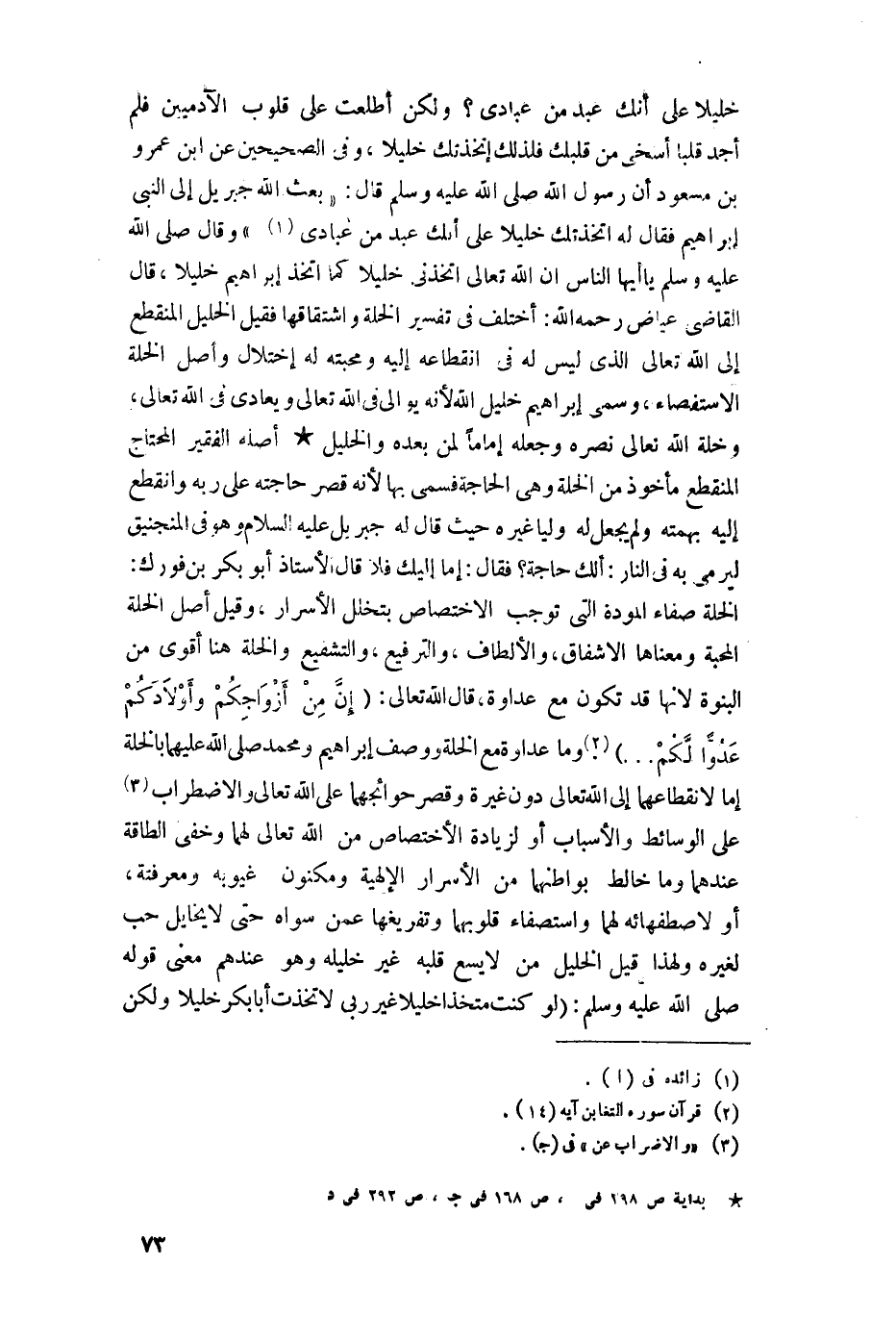 إن اللَّه تعالى اتخذني خليلًا كما اتخذ إبراهيم خليلا"، قال القاضي عياض رحمه اللَّه: اختلف في تفسير الخلة واشتقاقها فقيل: الخليل المنقطع إلى اللَّه تعالى الذي ليس له في انقطاعه إليه ومحبته له اختلال وأصل الخلة الاستقصاء، وسمي إبراهيم خليل اللَّه لأنه يوالي في اللَّه تعالى ويعادي في اللَّه تعالى، وخلة اللَّه تعالى نصره وجعله إمامًا لمن بعده والخليل أصله الفقير المحتاج المنقطع مأخوذ من الخلة وهي الحاجة فسمي بها لأنه قصر حاجته على ربه وانقطع إليه بهمته ولم يجعل له وليا غيره حيث قال له جبريل -عليه السلام- وهو في المنجنيق ليرمى به في النار: ألك حاجة؟ فقال: أما إليك فلا.