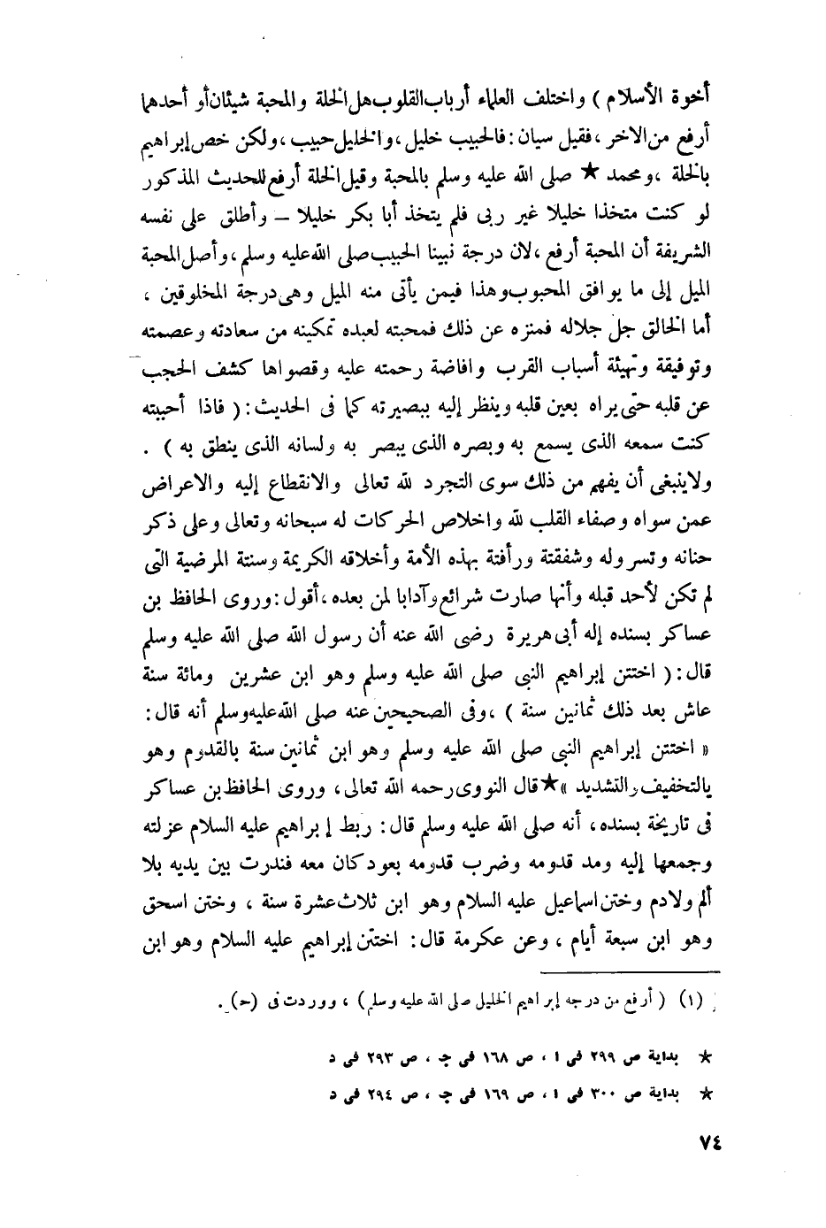 واختلف العلماء أرباب القلوب هل الخلة والمحبة شيئان أو أحدهما أرفع من الآخر، فقيل سيان، فالحبيب خليل، والخليل حبيب، ولكن خص إبراهيم بالخلة، ومحمد -صلى اللَّه عليه وسلم- بالمحبة وقيل: الخلة أرفع للحديث المذكور لو كنت متخذا خليلًا غير ربي؛ فلم يتخذ أبا بكر خليلا -وأطلق على نفسه الشريفة أن المحبة أرفع لأن درجة نبينا