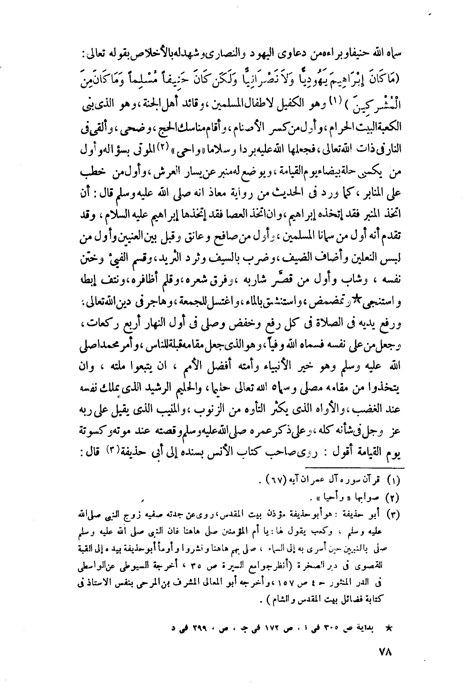 سماه اللَّه حنيفًا وبرأه من دعاوي اليهود والنصارى وشهد له بالإخلاص بقوله تعالى: {مَا كَانَ إِبْرَاهِيمُ يَهُودِيًّا وَلَا نَصْرَانِيًّا وَلَكِنْ كَانَ حَنِيفًا مُسْلِمًا وَمَا كَانَ مِنَ الْمُشْرِكِينَ} [آل عمران: 67] وهو الكفيل لأطفال المسلمين وقائد أهل الجنة، وهو الذي بنى الكعبة البيت الحرام، وأول من كسَّر الأصنام، وأقام مناسك الحج، وضحى، وألقي في النار في ذات اللَّه تعالى، فجعلها اللَّه عليه بردًا وسلامًا "وأحيا" الموتى بسؤاله وأول من يكسى حلة بيضاء يوم القيامة، ويوضع له منبر عن يسار العرش، وأول من خطب على المنابر، كما ورد في الحديث من رواية معاذ أنه صلى اللَّه عليه وسلم قال: "إن اتخذ المنبر فقد اتخذه إبراهيم، وإن أتخذ العصا فقد اتخذها إبراهيم عليه السلام".