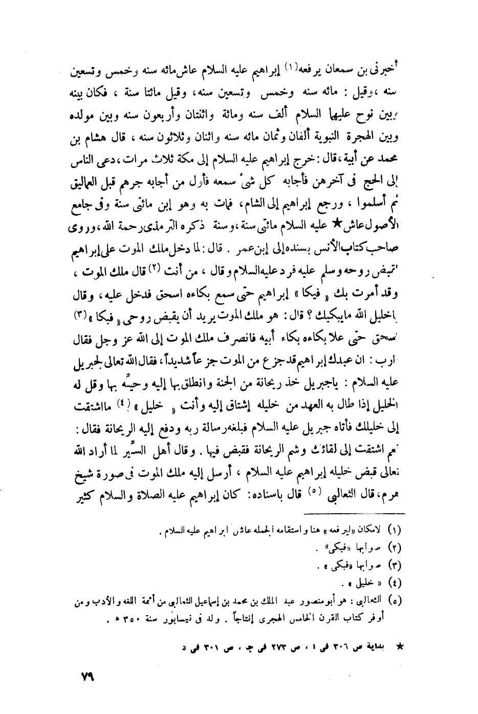 وروى صاحب كتاب الأنس بسنده إلى ابن عمر، قال: لما دخل ملك الموت على إبراهيم لقبض روحه وسلم عليه فرد عليه السلام، وقال: من أنت قال ملك الموت، وقد أمرت بك "فبكى" إبراهيم حتى سمع بكاءه إسحاق فدخل عليه، وقال يا خليل اللَّه ما يبكيك؟ قال: هو ملك الموت يريد أن يقبض روحى فبكى إسحاق حتى علا بكاءه بكاء أبيه فانصرف ملك الموت إلى اللَّه عز وجل فقال يا رب: إن عبدك إبراهيم قد جزع من الموت جزعًا شديدًا، فقال اللَّه تعالى لجبريل -عليه السلام-: يا جبريل خذ ريحانة من الجنة وانطلق بها إليه وحيه بها وقل له الخليل إذا طال به العهد من خليله اشتاق إليه وأنت خليل ما اشتقت إلى خليلك فأتاه جبريل -عليه السلام- فبلغه رسالة ربه ودفع إليه الريحانة فقال: نعم اشتقت إلى لقائك وشم الريحانة فقبض فيها، وقال أهل السير لما أراد اللَّه تعالى قبض خليله إبراهيم عليه السلام، أرسل إليه ملك الموت في صورة شيخ هرم، قال الثعالبي بإسناده: كان إبراهيم -عليه السلام- كثير