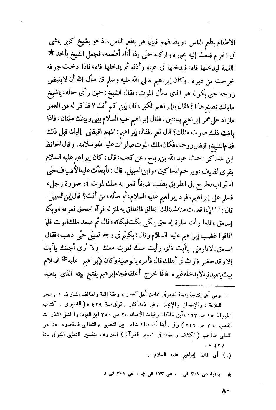 الإطعام يطعم الناس، ويضيفهم فبينما هو يطعم الناس، إذ هو بشيخ كبير يمشي في الحرم فبعث إليه بحماره وأركبه حتى إذا أتاه أطعمه، فجعل الشيخ يأخذ اللقمة ليدخلها فاه، فيدخلها في عينه وأذنه ثم يدخلها فاه، فإذا دخلت جوفه خرجت من دبره وكان إبراهيم -صلى اللَّه عليه وسلم- قد سأل اللَّه أن لا يقبض روحه حتى يكون هو الذي يسأل الموت، فقال للشيخ: حين رأى حاله، يا شيخ ما بالك تصنع هذا؟ فقال يا إبراهيم الكبر، قال ابن كم أنت؟ فذكر له من العمر ما زاد على عمر إبراهيم بسنتين، فقال إبراهيم -عليه السلام- بينى وبينك سنتان، فإذا بلغت ذلك صرت مثلك؟ قال نعم. فقال إبراهيم: اللهم اقبضنى إليك قبل ذلك فقام الشيخ وقبض روحه، فكان ملك الموت صلوات اللَّه عليه وسلامه.