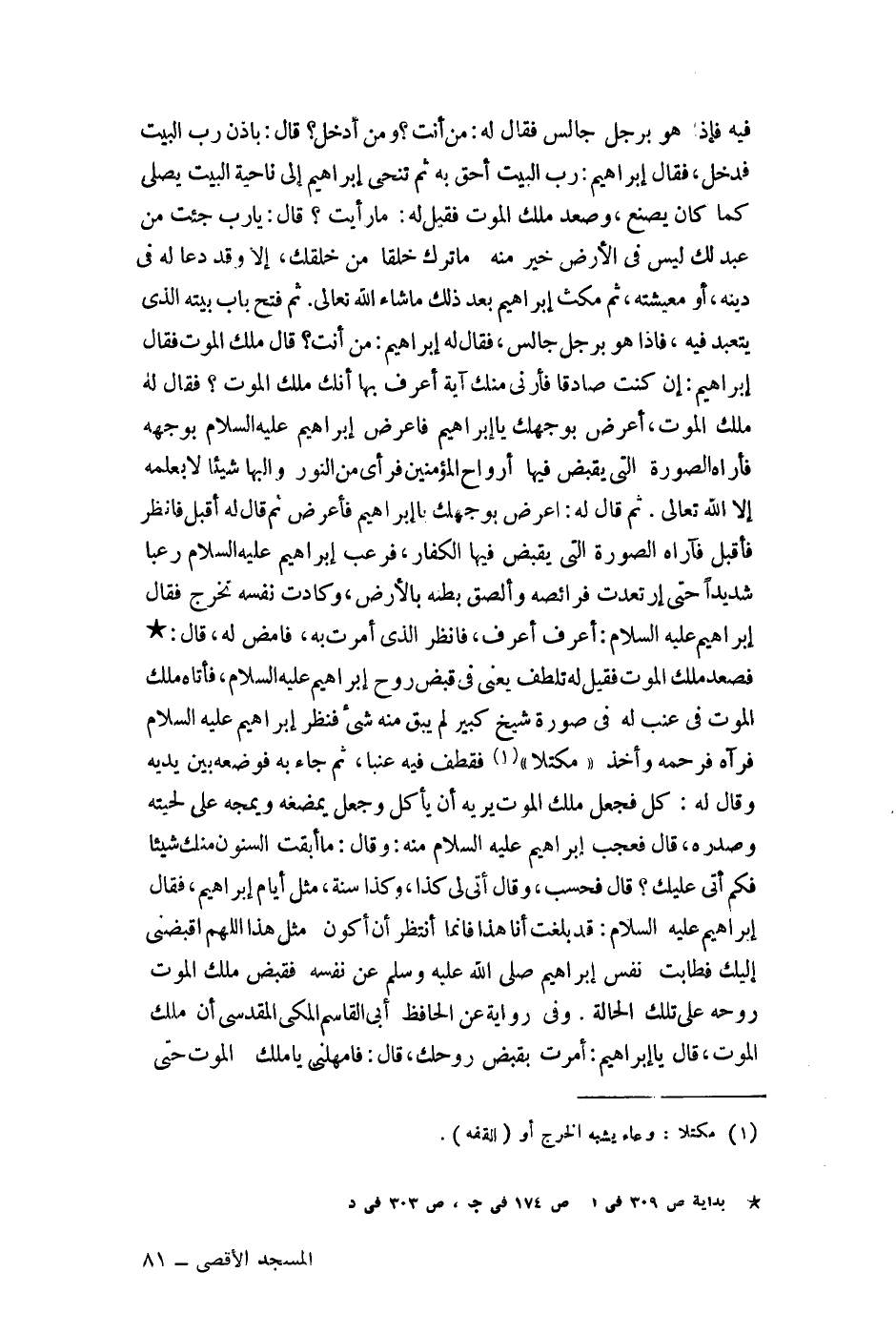 إبراهيم عليه السلام منه: وقال: ما أبقت السنون منك شيئًا فكم أتى عليك؟ قال فحسب، وقال أتى لي كذا، وكذا سنة، مثل أيام إبراهيم، فقال إبراهيم عليه السلام، قد بلغت أنا هذا فإنما أنتظر أن أكون مثل هذا اللهم اقبضني إليك فطابت نفس إبراهيم -صلى اللَّه عليه وسلم- عن نفسه فقبض ملك الموت روحه على تلك الحالة.