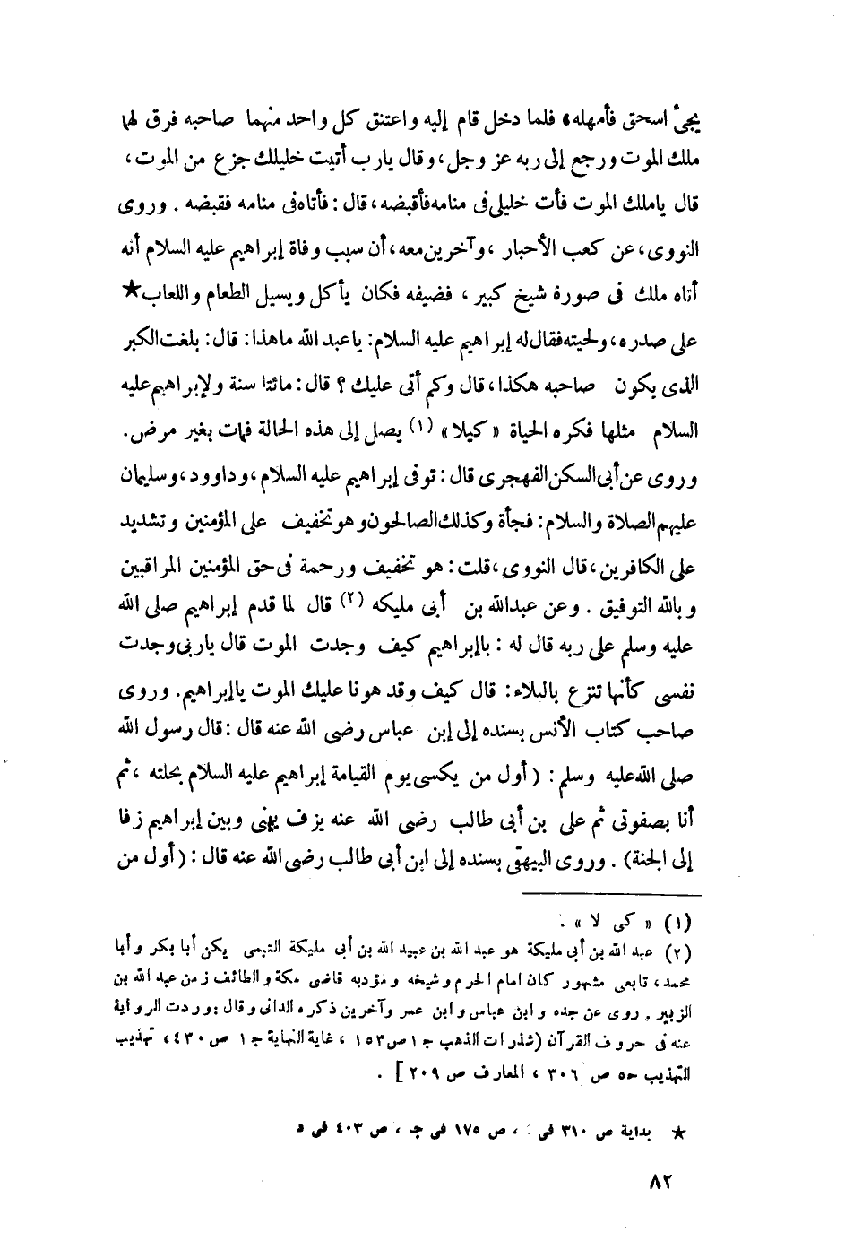 يجيء إسحاق فأمهله، فلما دخل قام إليه واعتنق كل واحد منهما صاحبه فرق لهما ملك الموت ورجع إلى ربه عز وجل، وقال يا رب أتيت خليلك جزع من الموت قال يا ملك الموت فأت خليلي في منامه فاقبضه، قال: فأتاه في منامه فقبضه، وروى النووي، عن كعب الأحبار، وآخرين معه، أن سبب وفاة إبراهيم عليه السلام أنه أتاه ملك في صورة شيخ كبير، فضيفه فكان يأكل ويسيل الطعام واللعاب على صدره، ولحيته فقال له إبراهيم عليه السلام، يا عبد اللَّه ما هذا: قال: بلغت الكبر الذي يكون صاحبه هكذا، قال وكم أتى عليك؟ قال: مائتا سنة وإبراهيم عليه السلام مثلها فكره الحياة "كي لا" يصل إلى هذه الحالة فمات بغير مرض وروي عن أبي السكن الفهجري قال: توفي إبراهيم عليه السلام، وداود، وسليمان عليهم الصلاة والسلام، فجأة وكذلك الصالحون وهو تخفيف على المؤمنين وتشديد على الكافرين، قال النووي، قلت: هو تخفيف ورحمة في حق المؤمنين المراقبين وباللَّه التوفيق. وعن عبد اللَّه بن أبي مليكة قال لما قدم إبراهيم -صلى اللَّه عليه وسلم- على ربه قال له: يا إبراهيم كيف وجدت الموت قال يا ربي وجدت نفسي كأنها تنزع بالبلاء، قال كيف وقد هوَّنا عليك الموت يا إبراهيم.