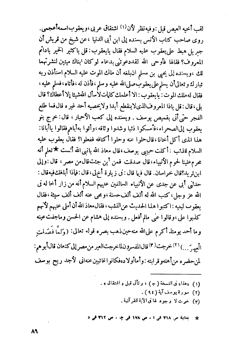 لقب أخيه العيص قيل: وفيه نظر لأنه اشتقاق عربي، ويعقوب اسمه أعجمى. روي صاحب كتاب الإنس بسنده إلى ابن أبي الدنيا، عن شيخ من قريش أن جبريل هبط على يعقوب عليه السلام فقال يا يعقوب: قل يا كثير الخير يا دائم المعروف؟ فقالها فأوحى اللَّه لقد دعوتنى بدعاء لو كان ابناك ميتين لنشرتهما لك، وبسنده إلى يحيى بن مسلم أن بلغه أن ملك الموت عليه السلام استأذن ربه تبارك وتعالى أن يسلم على يعقوب -صلى اللَّه عليه وسلم-، فأذن له، فأتاه، فسلم عليه، فقال له ملك الموت: يا يعقوب: ألا