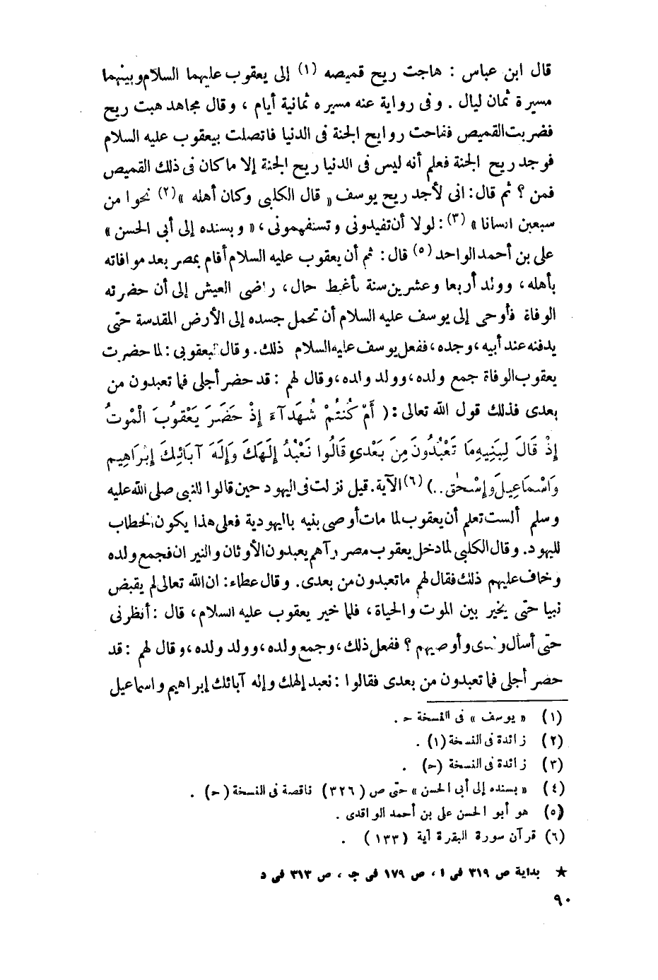 قال ابن عباس: هاجت ريح قميصه إلى يعقوب عليهما السلام وبينهما مسيرة ثماني ليال، وفي رواية عنه مسيرة ثمانية أيام، وقال مجاهد هبت ريح فضربت القميص ففاحت روائح الجنة في الدنيا فاتصلت بيعقوب عليه السلام فوجد ريح الجنة فعلم أنه ليس في الدنيا ريح الجنة إلا ما كان في ذلك القميص فمن؟ ثم قال: إلي لأجد ريح يوسف، قال الكلبي وكان أهله نحوًا من سبعين إنسانًا: لولا أن تفيدوني وتستفهموني، وبسنده إلى أبي الحسن علي بن أحمد الواقدي قال: ثم إن يعقوب عليه السلام أقام بمصر بعد موافاته بأهله، وولد أربعًا وعشرين سنة بأغبط حال، راضي العيش إلى أن حضرته الوفاة فأوحى إلى يوسف عليه السلام أن، تحمل جسده إلى الأرض المقدسة حتى تدفنه عند أبيه، وجده ففعل يوسف عليه السلام، ذلك، وقال البعقوبي: لما حضرت يعقوب الوفاة جمع ولده، وولده، وقال لهم: قد حضر أجلي فما تعبدون من بعدي فذلك قول اللَّه تعالى: {أَمْ كُنْتُمْ شُهَدَاءَ إِذْ حَضَرَ يَعْقُوبَ الْمَوْتُ إِذْ قَالَ لِبَنِيهِ مَا