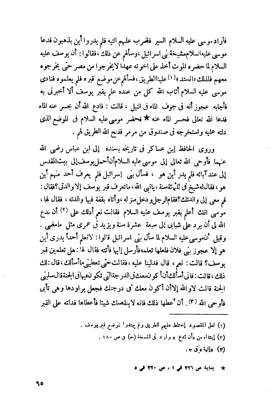 وروى الحافظ ابن عساكر في تاريخه بسنده إلى ابن عباس رضي اللَّه عنهما فأوحى اللَّه تعالى إلى موسى عليه السلام أن احمل يوسف إلى بيت المقدس إلى عند آبائه فلم يدر أين هو، فسأل بني إسرائيل فلم يعرف أحد منهم أين هو، فقال له شيخ في ثلاثمائة سنة، يا نبي اللَّه، ما تعرف قبر يوسف إلا والدتي؟ فقال: قم معي إلى والدتك؟ فقام الرجل ودخل منزله، وأتاه بقفة فيها والدته، فقال لها، موسى إنك أعلم بقبر يوسف عليه السلام؟ فقالت: نعم أدلك على أن تدعو اللَّه لي أن يرد عليَّ شبابي إلى سبع عشرة سنة ويزيد في عمري مثل ما مضى وقيل إن موسى عليه السلام لما سأل بني إسرائيل قالوا: لا نعلم أحدًا يدري أين هو إلا عجوز بني فلان فلعلها تعلمه فأرسل إليها فأتته فقال لها: هل تعلمين قبر يوسف؟ قالت: نعم، قال فدلينا عليه، فقالت حتى تعطني ما أسألك، قال: لك ذلك، قالت: فإني أسألك أن أكون معك في الدرجة التي تكون فيها في الجنة.