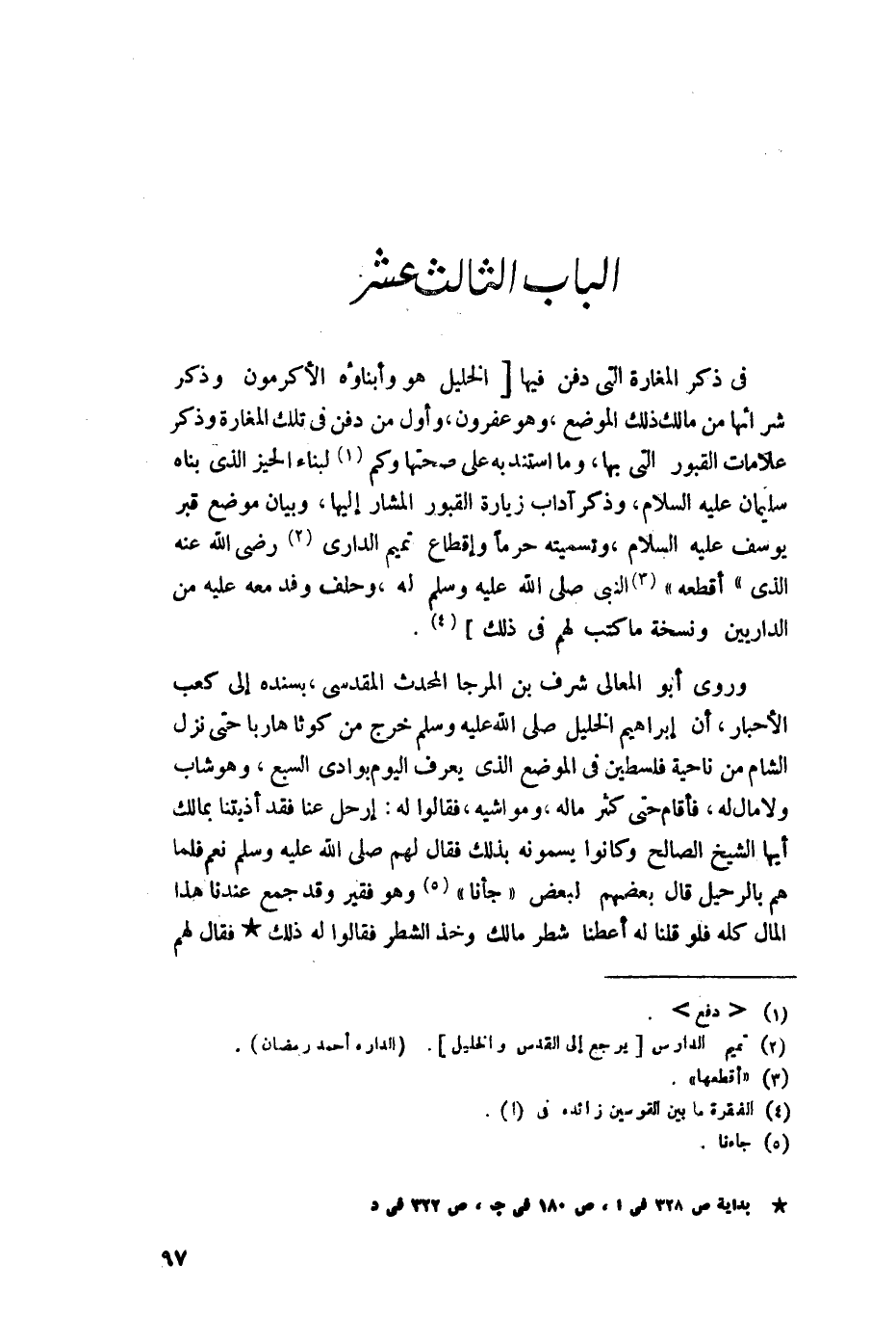في ذكر المغارة التي دفن فيها الخليل هو وأبناؤه الأكرمون وذكر شرائها من مالك ذلك الموضع، وهو عفرون، وأول من دفن في تلك المغارة وذكر علامات القبور التي بها، وما استند به على صحتها وكم دفع لبناء الحيز الذي بناه سليمان عليه السلام، وذكر آداب زيارة القبور المشار إليها، وبيان موضع قبر يوسف عليه السلام وتسميته