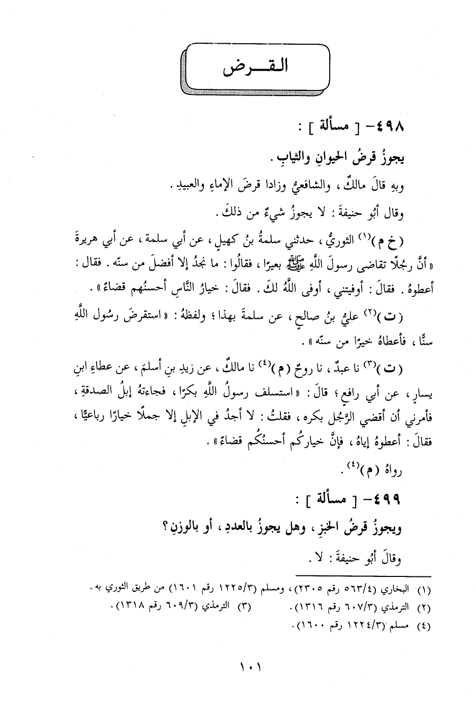 (ت) نَا عبد، نَا روح (م) نَا مَالك، عَن زيد بن أسلم، عَن عَطاء ابْن يسَار، عَن أبي رَافع؛ قَالَ: " استسلف رَسُول الله بكرا، فَجَاءَتْهُ إبل الصَّدَقَة، فَأمرنِي أَن أَقْْضِي الرجل بكره، فَقلت: لَا أجد فِي الْإِبِل إِلَّا جملا خياراً رباعياً، فَقَالَ: أَعْطوهُ إِيَّاه، فَإِن خياركم أحسنكم قَضَاء ".