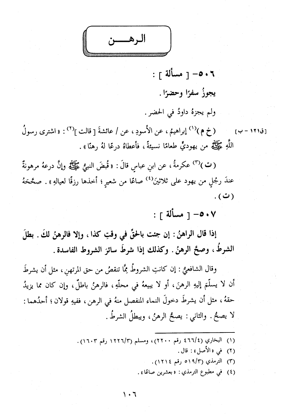 (ت) عِكْرِمَة، عَن ابْن عَبَّاس قَالَ: " قبض النَّبِي [صلى الله عَلَيْهِ وَسلم] وَإِن درعه مَرْهُونَة عِنْد رجل من يهود على ثَلَاثِينَ صَاعا من شعير؛ أَخذهَا رزقا لِعِيَالِهِ ". صَححهُ (ت) .