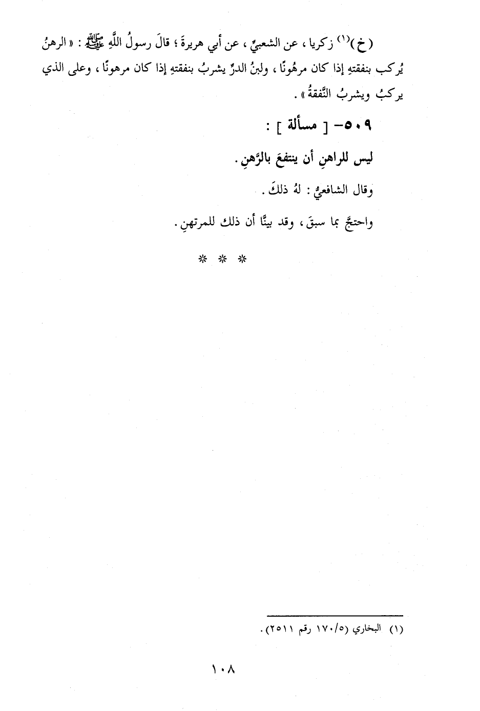 (خَ) زَكَرِيَّا، عَن الشّعبِيّ، عَن أبي هُرَيْرَة؛ قَالَ رَسُول الله [صلى الله عَلَيْهِ وَسلم] : " الرَّهْن يركب بِنَفَقَتِهِ إِذا كَانَ مَرْهُونا، وَلبن الدّرّ يشرب بِنَفَقَتِهِ إِذا كَانَ مَرْهُونا، وعَلى الَّذِي يركب وَيشْرب النَّفَقَة ".