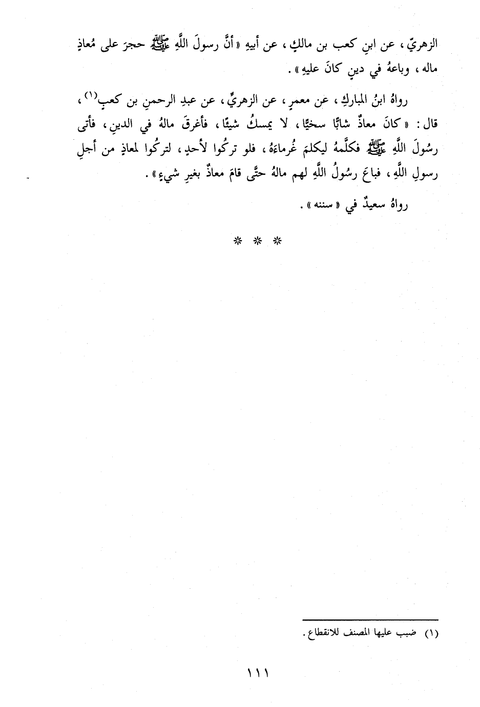 الزُّهْرِيّ، عَن ابْن كَعْب بن مَالك، عَن أَبِيه " أَن رَسُول الله [صلى الله عَلَيْهِ وَسلم] حجر على معَاذ مَاله، وَبَاعه فِي دين كَانَ عَلَيْهِ ".