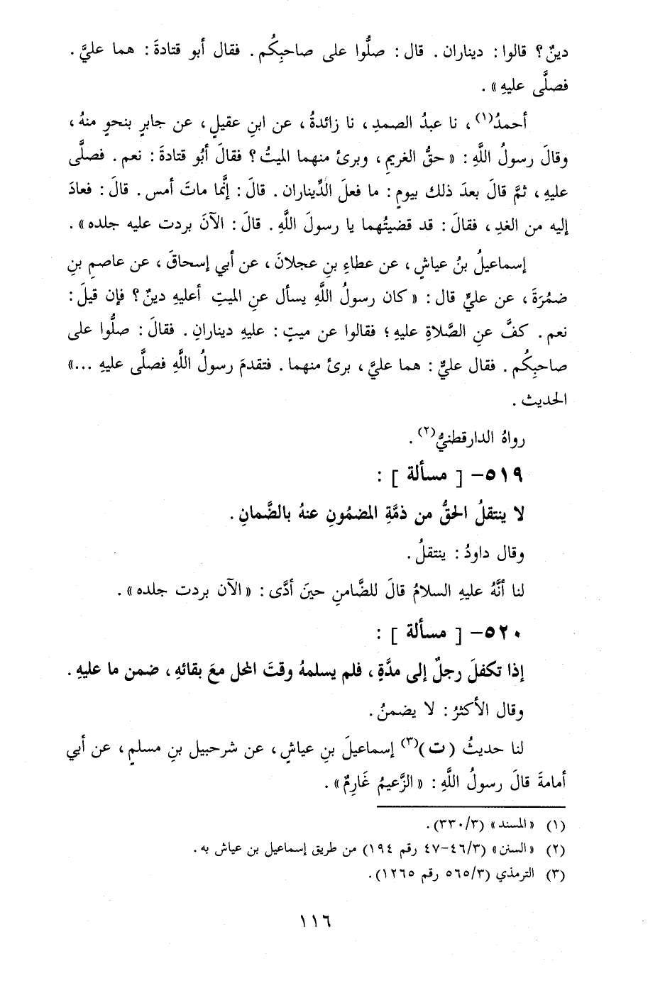إِسْمَاعِيل بن عَيَّاش، عَن عَطاء بن عجلَان، عَن أبي إِسْحَاق، عَن عَاصِم بن ضَمرَة، عَن عَليّ قَالَ: " كَانَ رَسُول الله يسْأَل عَن الميتِ أعليه دين؟ فَإِن قيل: نعم. كف عَن الصَّلَاة عَلَيْهِ؛ فَقَالُوا عَن ميت: عَلَيْهِ دِينَارَانِ. فَقَالَ: صلوا على صَاحبكُم. فَقَالَ عَليّ: هما عَليّ، برِئ مِنْهُمَا. فَتقدم رَسُول الله فصلى عَلَيْهِ ... "