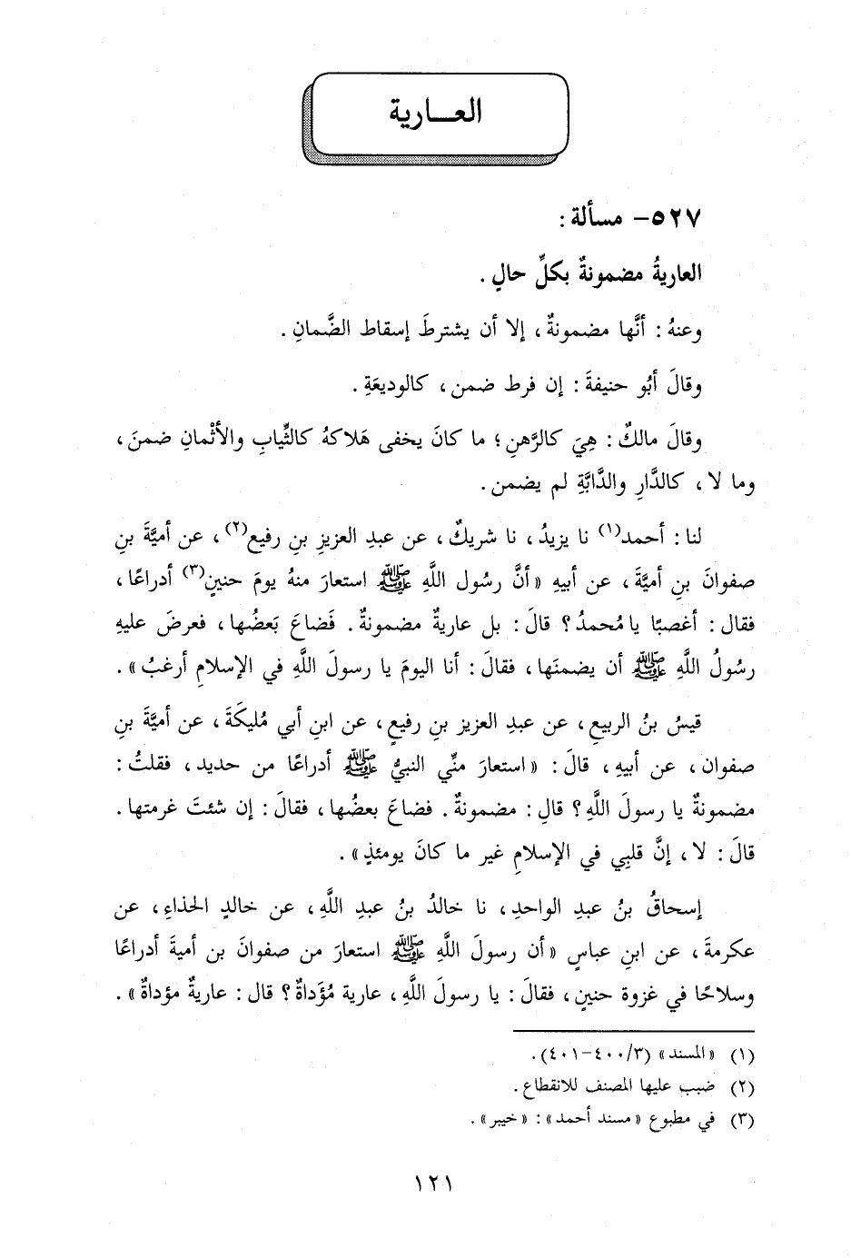 لنا: أَحْمد نَا يزِيد، نَا شريك، عَن عبد الْعَزِيز بن رفيع، عَن أُميَّة بن صَفْوَان بن أُميَّة، عَن أَبِيه " أَن رَسُول الله [صلى الله عَلَيْهِ وَسلم] اسْتعَار مِنْهُ يَوْم حنين أدراعاً، فَقَالَ: أغصبا يَا مُحَمَّد؟ قَالَ: بل عَارِية مَضْمُونَة. فَضَاعَ بَعْضهَا، فَعرض عَلَيْهِ رَسُول الله [صلى الله عَلَيْهِ وَسلم] أَن يضمنهَا، فَقَالَ: أَنا الْيَوْم يَا رَسُول الله فِي الْإِسْلَام أَرغب ".
