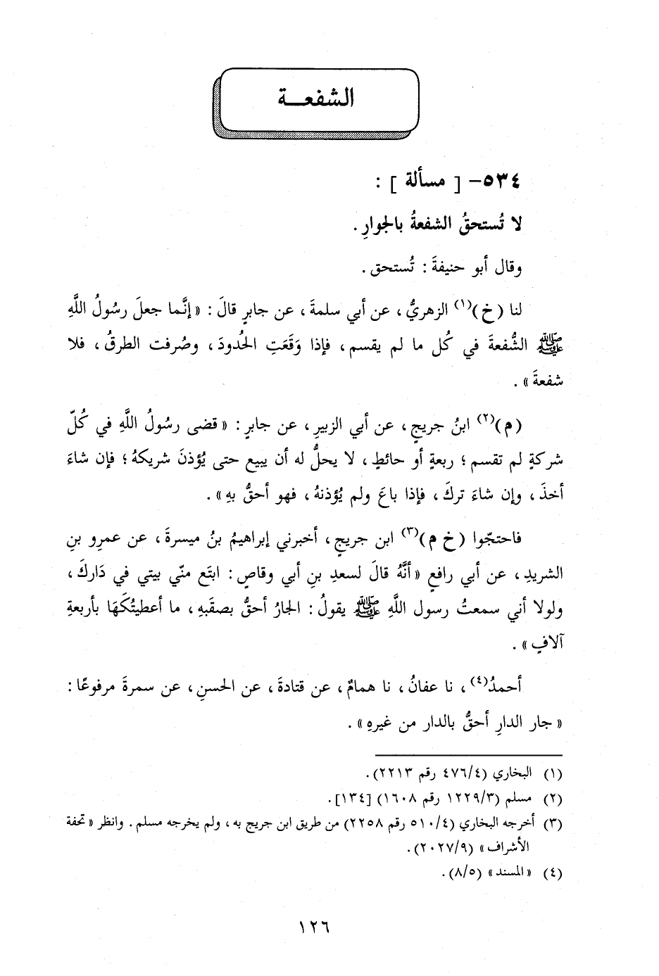 لنا (خَ) الزُّهْرِيّ، عَن أبي سَلمَة، عَن جَابر قَالَ: " إِنَّمَا جعل رَسُول الله [صلى الله عَلَيْهِ وَسلم] الشُّفْعَة فِي كل مَا لم يقسم، فَإِذا وَقعت الْحُدُود، وصرفت الطّرق، فَلَا شُفْعَة ".