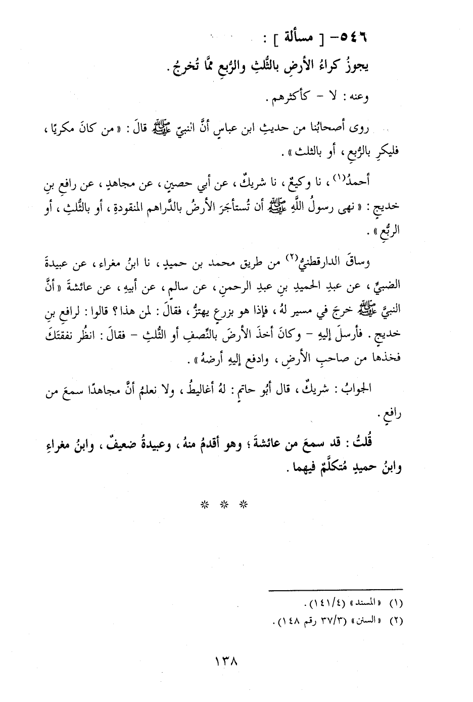 أَحْمد، نَا وَكِيع، نَا شريك، عَن أبي حُصَيْن، عَن مُجَاهِد، عَن رَافع بن خديج: " نهى رَسُول الله [صلى الله عَلَيْهِ وَسلم] أَن تستأجر الأَرْض بِالدَّرَاهِمِ المنقودة، أَو بِالثُّلثِ، أَو الرّبع ".