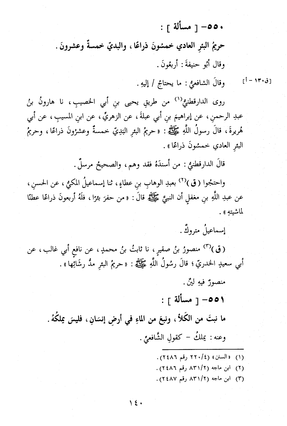 روى الدَّارَقُطْنِيّ من طَرِيق يحيى بن أبي الخصيب، نَا هَارُون بن عبد الرَّحْمَن، عَن إِبْرَاهِيم بن أبي عبلة، عَن الزُّهْرِيّ، عَن ابْن الْمسيب، عَن أبي هُرَيْرَة، قَالَ رَسُول الله [صلى الله عَلَيْهِ وَسلم] : " حَرِيم الْبِئْر الْبَدِيِّ خَمْسَة وَعِشْرُونَ ذِرَاعا، وحريم الْبِئْر العادي خَمْسُونَ ذِرَاعا ".