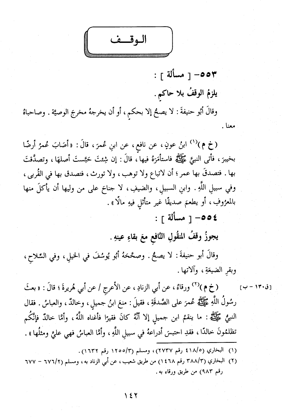 (خَ م) ابْن عون، عَن نَافِع، عَن ابْن عمر، قَالَ: " أصَاب عمر أَرضًا بِخَيْبَر، فَأتى النَّبِي [صلى الله عَلَيْهِ وَسلم] فاستأمره فِيهَا، قَالَ: إِن شِئْت حبست أَصْلهَا، وتصدقت بهَا. فَتصدق بهَا عمر؛ أَن لَا تبَاع وَلَا توهب، وَلَا تورث، فَتصدق بهَا فِي الْقُرْبَى، وَفِي سَبِيل الله. وَابْن السَّبِيل، والضيف، لَا جنَاح على من وَليهَا أَن يَأْكُل مِنْهَا بِالْمَعْرُوفِ، أَو يطعم صديقا غير متأثل فِيهِ مَالا ".