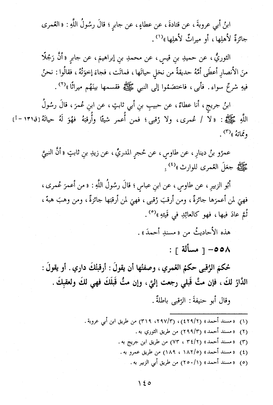ابْن جريج، أَنا عَطاء، عَن حبيب بن أبي ثَابت، عَن ابْن عمر، قَالَ رَسُول الله [صلى الله عَلَيْهِ وَسلم] : " لَا [ق 131 - أ] / عمرى، وَلَا رقبى؛ فَمن أعمر شَيْئا وأرقبه فَهُوَ لَهُ حَيَاته ومماته ".