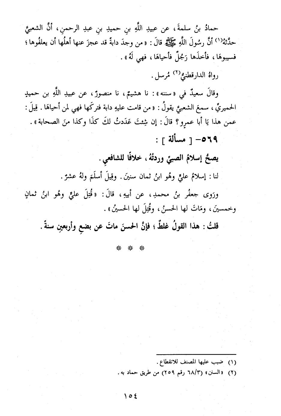 حَمَّاد بن سَلمَة، عَن عبيد الله بن حميد بن عبد الرَّحْمَن، أَن الشّعبِيّ حَدثهُ أَن رَسُول الله [صلى الله عَلَيْهِ وَسلم] قَالَ: " من وجد دَابَّة قد عجز عَنْهَا أَهلهَا أَن يعلفوها؛ فسيبوها، فَأَخذهَا رجل فأحياها، فَهِيَ لَهُ ".