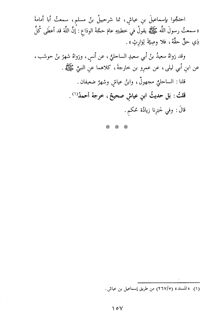 احْتَجُّوا بِإِسْمَاعِيل بن عَيَّاش، ثَنَا شُرَحْبِيل بن مُسلم، سَمِعت أَبَا أُمَامَة " سَمِعت رَسُول الله [صلى الله عَلَيْهِ وَسلم] يَقُول فِي خطبَته عَام حجَّة الْوَدَاع: إِن الله قد أعْطى كل ذِي حق حَقه، فَلَا وَصِيَّة لوَارث ".