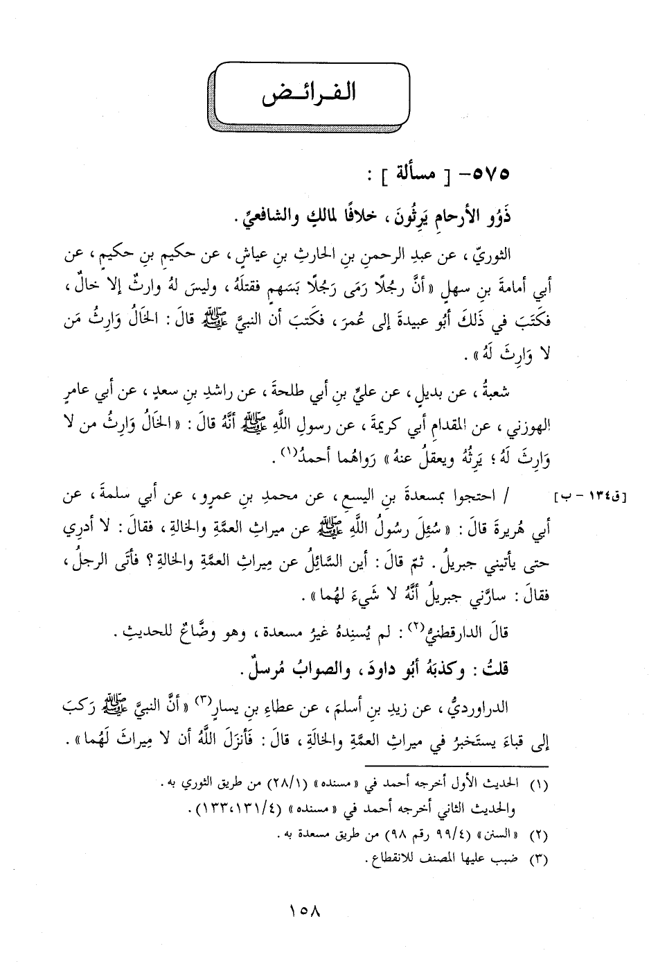 ذَوُو الْأَرْحَام يَرِثُونَ، خلافًا لمَالِك وَالشَّافِعِيّ.