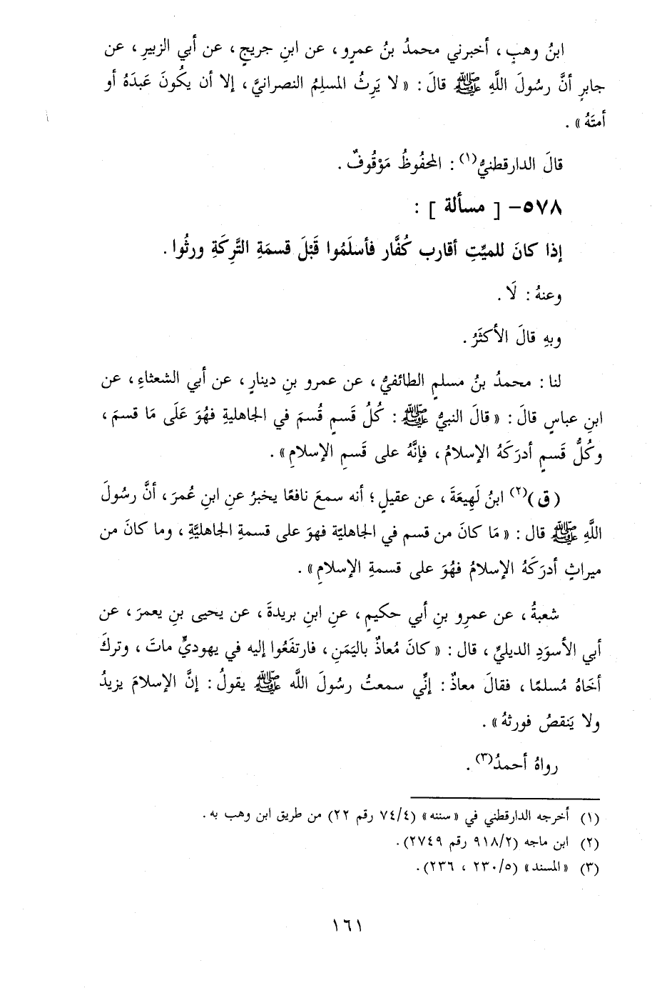 ابْن وهب، أَخْبرنِي مُحَمَّد بن عَمْرو، عَن ابْن جريج، عَن أبي الزبير، عَن جَابر أَن رَسُول الله [صلى الله عَلَيْهِ وَسلم] قَالَ: " لَا يَرث الْمُسلم النَّصْرَانِي، إِلَّا أَن يكون عَبده أَو أمته ".