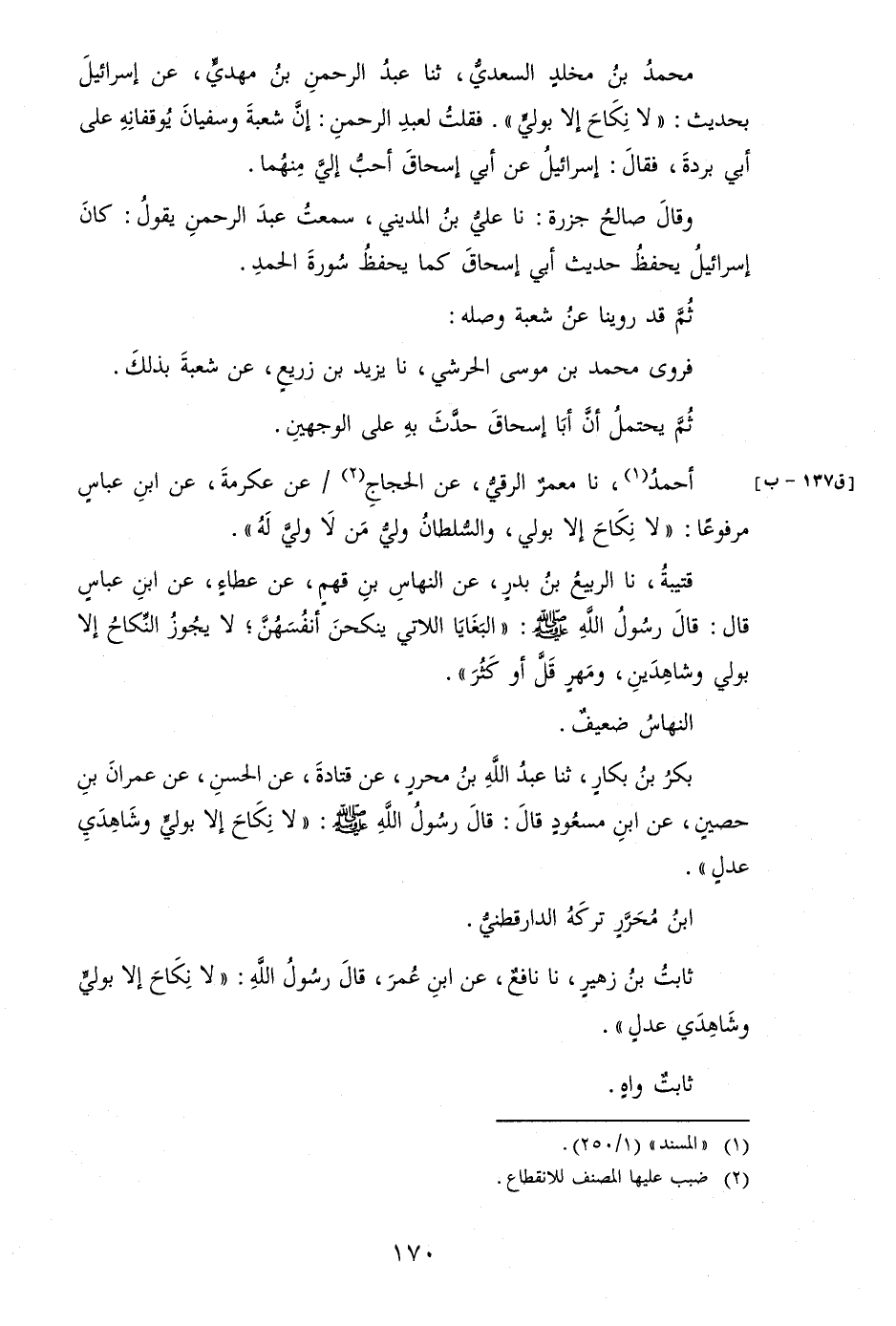 مُحَمَّد بن مخلد السَّعْدِيّ، ثَنَا عبد الرَّحْمَن بن مهْدي، عَن إِسْرَائِيل بِحَدِيث: " لَا نِكَاح إِلَّا بولِي ". فَقلت لعبد الرَّحْمَن: إِن شُعْبَة وسُفْيَان يوقفانه على أبي بردة، فَقَالَ: إِسْرَائِيل عَن أبي إِسْحَاق أحب إِلَيّ مِنْهُمَا.