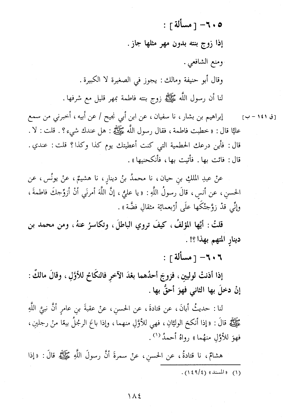 إِبْرَاهِيم بن بشار، نَا سُفْيَان، عَن ابْن أبي نجيح [ق 141 - ب] / عَن أَبِيه، أَخْبرنِي من سمع عليا قَالَ: " خطبت فَاطِمَة، فَقَالَ رَسُول الله [صلى الله عَلَيْهِ وَسلم] : هَل عنْدك شَيْء؟ . قلت: لَا. قَالَ: فَأَيْنَ درعك الحطمية الَّتِي كنت أَعطيتك يَوْم كَذَا وَكَذَا؟ قلت: عِنْدِي. قَالَ: فَائت بهَا. فَأتيت بهَا، فأنكحنيها ".