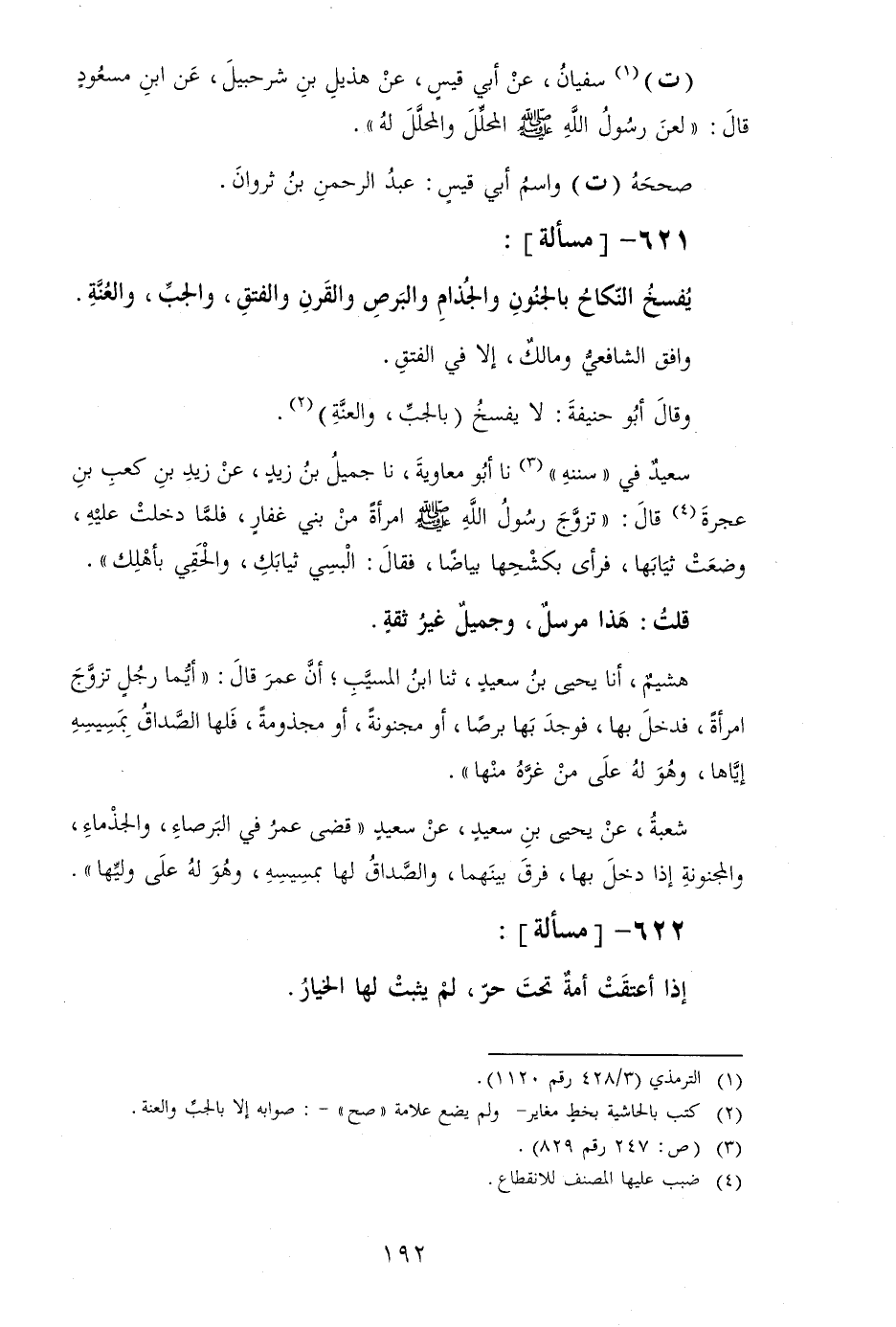 هشيم، أَنا يحيى بن سعيد، ثَنَا ابْن الْمسيب؛ أَن عمر قَالَ: " أَيّمَا رجل تزوج امْرَأَة، فَدخل بهَا، فَوجدَ بهَا برصاً أَو مَجْنُونَة، أَو مجذومة، فلهَا الصَدَاق بمسيسه إِيَّاهَا، وَهُوَ لَهُ على من غره مِنْهَا ".