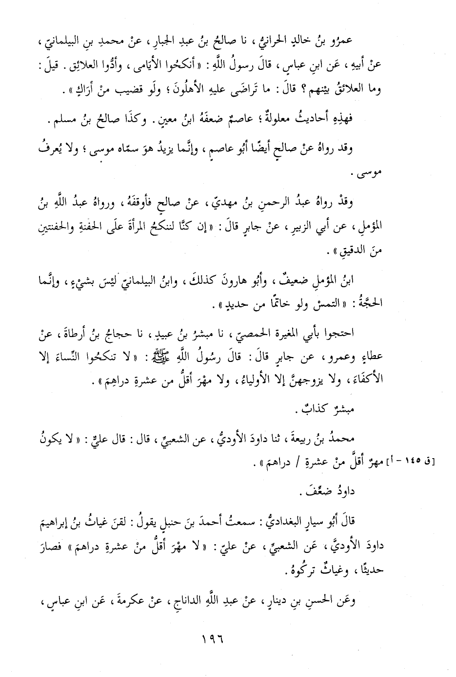 عَمْرو بن خَالِد الْحَرَّانِي، نَا صَالح بن عبد الْجَبَّار، عَن مُحَمَّد بن الْبَيْلَمَانِي، عَن أَبِيه، عَن ابْن عَبَّاس، قَالَ رَسُول الله: " أنكحوا الْأَيَامَى، وأدوا العلائق. قيل: وَمَا العلائق بَينهم؟ قَالَ: مَا تراضى عَلَيْهِ الأهلون؛ وَلَو قضيب من أراكٍ ".