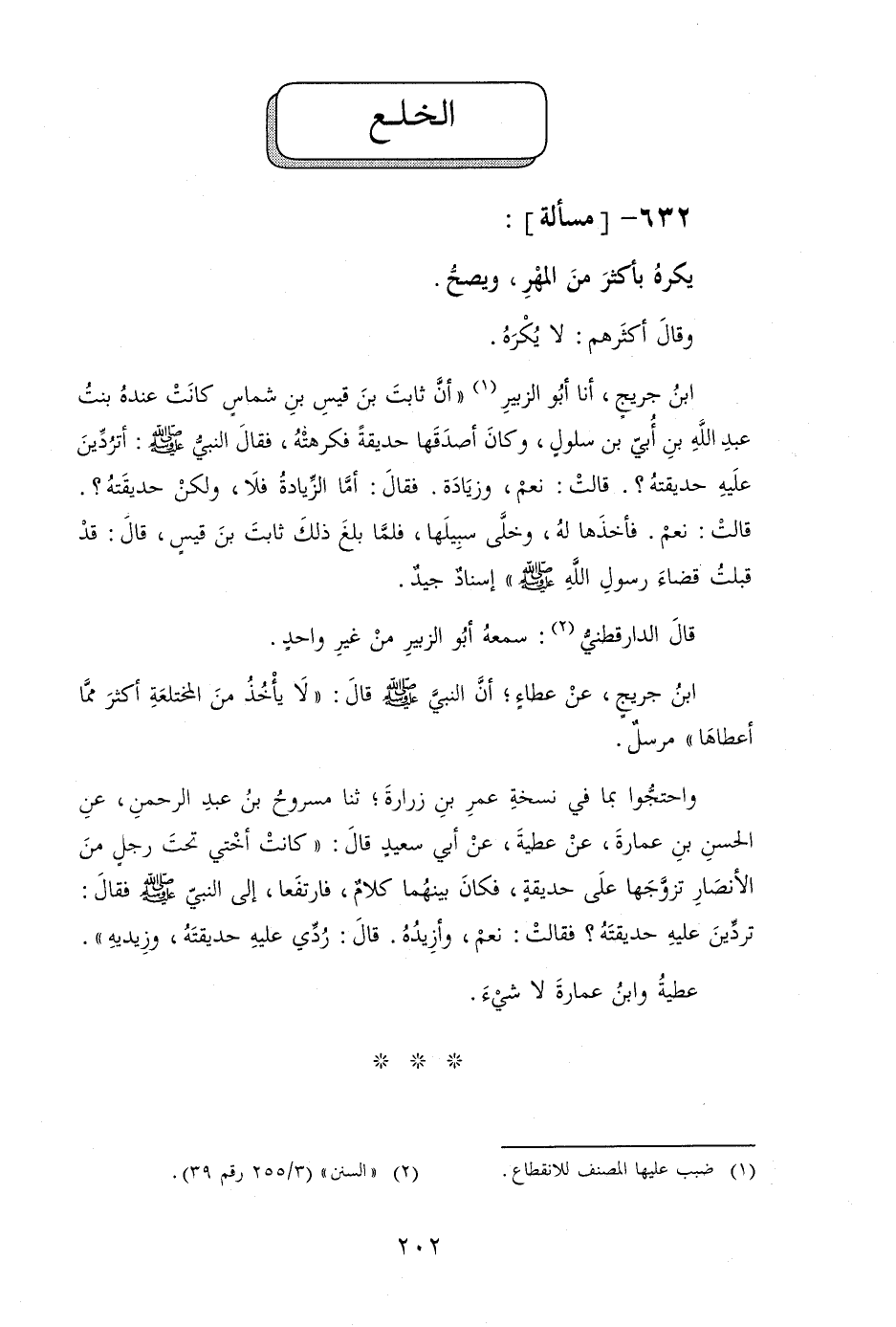 ابْن جريج، أَنا أَبُو الزبير " أَن ثَابت بن قيس بن شماس كَانَت عِنْده بنت عبد الله بن أُبيّ بن سلول، وَكَانَ أصدقهَا حديقة فَكَرِهته، فَقَالَ النَّبِي [صلى الله عَلَيْهِ وَسلم] : أَتردينَ عَلَيْهِ حديقته؟ . قَالَت: نعم، وَزِيَادَة. فَقَالَ: أما الزِّيَادَة فَلَا، وَلَكِن حديقته؟ . قَالَت: نعم. فَأَخذهَا لَهُ، وخلى سَبِيلهَا، فَلَمَّا بلغ ذَلِك ثَابت بن قيس، قَالَ: قد قبلت قَضَاء رَسُول الله [صلى الله عَلَيْهِ وَسلم] " إِسْنَاد جيد.