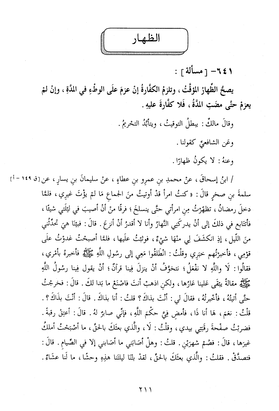 [ق 149 - أ] / ابْن إِسْحَاق، عَن مُحَمَّد بن عَمْرو بن عَطاء، عَن سُلَيْمَان بن يسَار، عَن سَلمَة بن صَخْر قَالَ: " كنت امْرأ قد أُوتيت من الْجِمَاع مَا لم يُؤْت غَيْرِي، فَلَمَّا دخل رَمَضَان، تطهرت من امْرَأَتي حَتَّى يَنْسَلِخ؛ فرقا من أَن أُصِيب فِي لَيْلَتي شَيْئا، فأتتابع فِي ذَلِك إِلَى أَن يدركني النَّهَار وَأَنا لَا أقدر أَن أنزع. قَالَ: فَبينا هِيَ تُحَدِّثنِي من اللَّيْل، إِذا انْكَشَفَ لي مِنْهَا شَيْء، فَوَثَبت عَلَيْهَا، فَلَمَّا أَصبَحت غَدَوْت على قومِي، فَأَخْبَرتهمْ خبري وَقلت: انْطَلقُوا معي إِلَى رَسُول الله [صلى الله عَلَيْهِ وَسلم] فَأخْبرهُ بأَمْري، فَقَالُوا: لَا وَالله لَا نَفْعل؛ نتخوف أَن ينزل فِينَا قُرْآن؛ أَن يَقُول فِينَا رَسُول الله [صلى الله عَلَيْهِ وَسلم] مقَالَة يبْقى علينا عارها، وَلَكِن اذْهَبْ أَنْت فَاصْنَعْ مَا بدا لَك. قَالَ: فَخرجت حَتَّى أَتَيْته، فَأَخْبَرته، فَقَالَ لي: أَنْت بِذَاكَ؟ قلت: أَنا بِذَاكَ. قَالَ: أَنْت بِذَاكَ؟ . قلت: نعم، هَا أَنا ذَا، فأمض فِي حكم الله، فَإِنِّي صابر لَهُ. قَالَ: أعتق رَقَبَة. فَضربت صفحة رقبتي بيَدي، وَقلت: لَا، وَالَّذِي بَعثك بِالْحَقِّ، مَا أَصبَحت أملك غَيرهَا، قَالَ: فَصم شَهْرَيْن. قلت: وَهل أصابني مَا أصابني إِلَّا فِي الصّيام. قَالَ: فَتصدق. فَقلت: وَالَّذِي بَعثك بِالْحَقِّ، لقد بتنا ليلتنا هَذِه وحشاً، مَا لنا عشَاء.