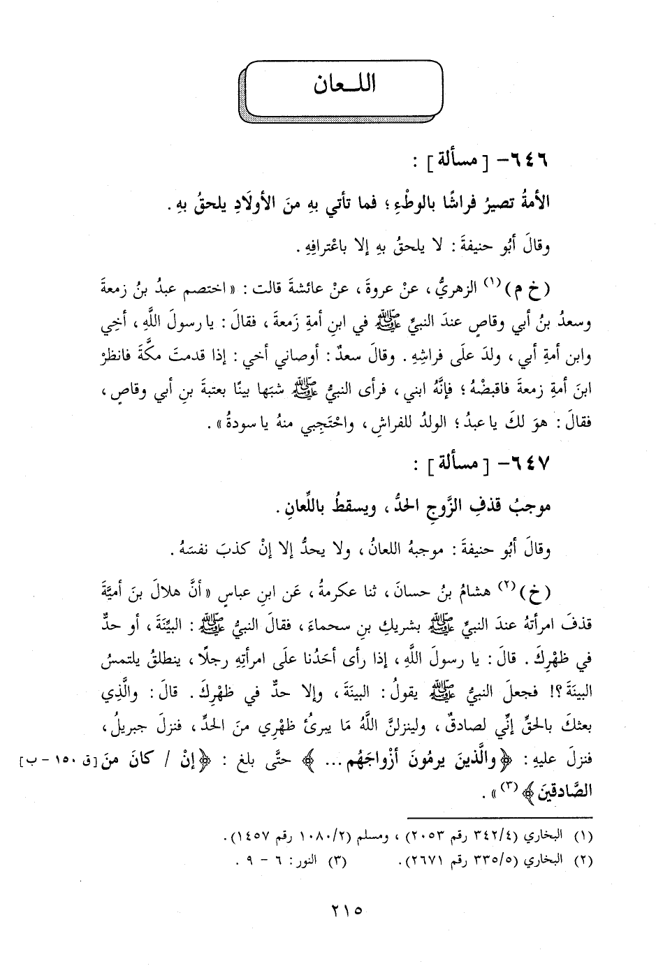 (خَ م) الزُّهْرِيّ، عَن عُرْوَة، عَن عَائِشَة قَالَت: " اخْتصم عبد بن زَمعَة وَسعد بن أبي وَقاص عِنْد النَّبِي [صلى الله عَلَيْهِ وَسلم] فِي ابْن أمة زَمعَة، فَقَالَ: يَا رَسُول الله، أخي وَابْن أمة أبي، ولد على فرَاشه. وَقَالَ سعد: أَوْصَانِي أخي: إِذا قدمت مَكَّة فَانْظُر ابْن أمة زَمعَة فاقبضه؛ فَإِنَّهُ ابْني، فَرَأى النَّبِي [صلى الله عَلَيْهِ وَسلم] شبها بَينا بِعتبَة بن أبي وَقاص، فَقَالَ: هُوَ لَك يَا عبد؛ الْوَلَد للْفراش، واحتجبي مِنْهُ يَا سَوْدَة ".