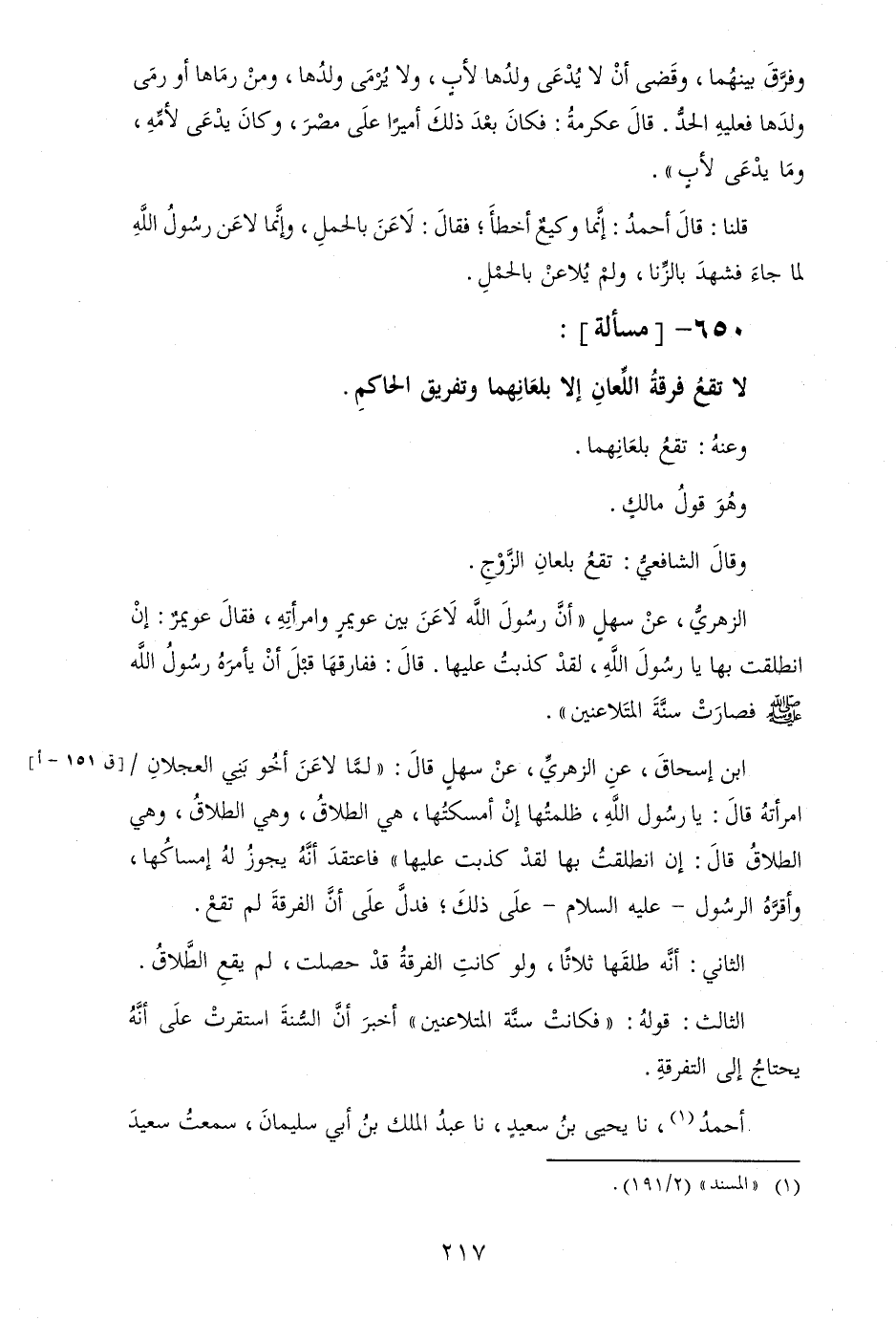 ابْن إِسْحَاق، عَن الزُّهْرِيّ، عَن سهل قَالَ: " لما لَاعن أَخُو بني العجلان [ق 151 - أ] / امْرَأَته قَالَ: يَا رَسُول الله، ظلمتها إِن أَمْسَكتهَا، هِيَ الطَّلَاق، وَهِي الطَّلَاق، وَهِي الطَّلَاق، قَالَ: إِن انْطَلَقت بهَا لقد كذبت عَلَيْهَا " فَاعْتقد أَنه يجوز لَهُ إِِمْسَاكهَا، وَأقرهُ الرَّسُول -[صلى الله عَلَيْهِ وَسلم]- على ذَلِك؛ فَدلَّ على أَن الْفرْقَة لم تقع.