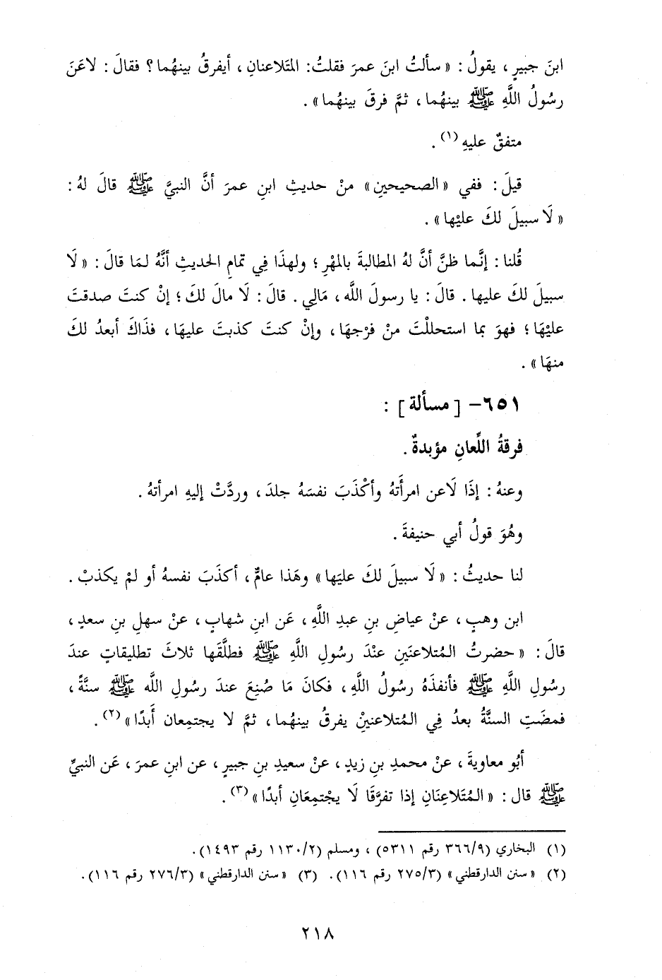 ابْن جُبَير، يَقُول: " سَأَلت ابْن عمر فَقلت: المتلاعنان، أيفرق بَينهمَا؟ فَقَالَ: لَاعن رَسُول الله [صلى الله عَلَيْهِ وَسلم] بَينهمَا، ثمَّ فرق بَينهمَا ".