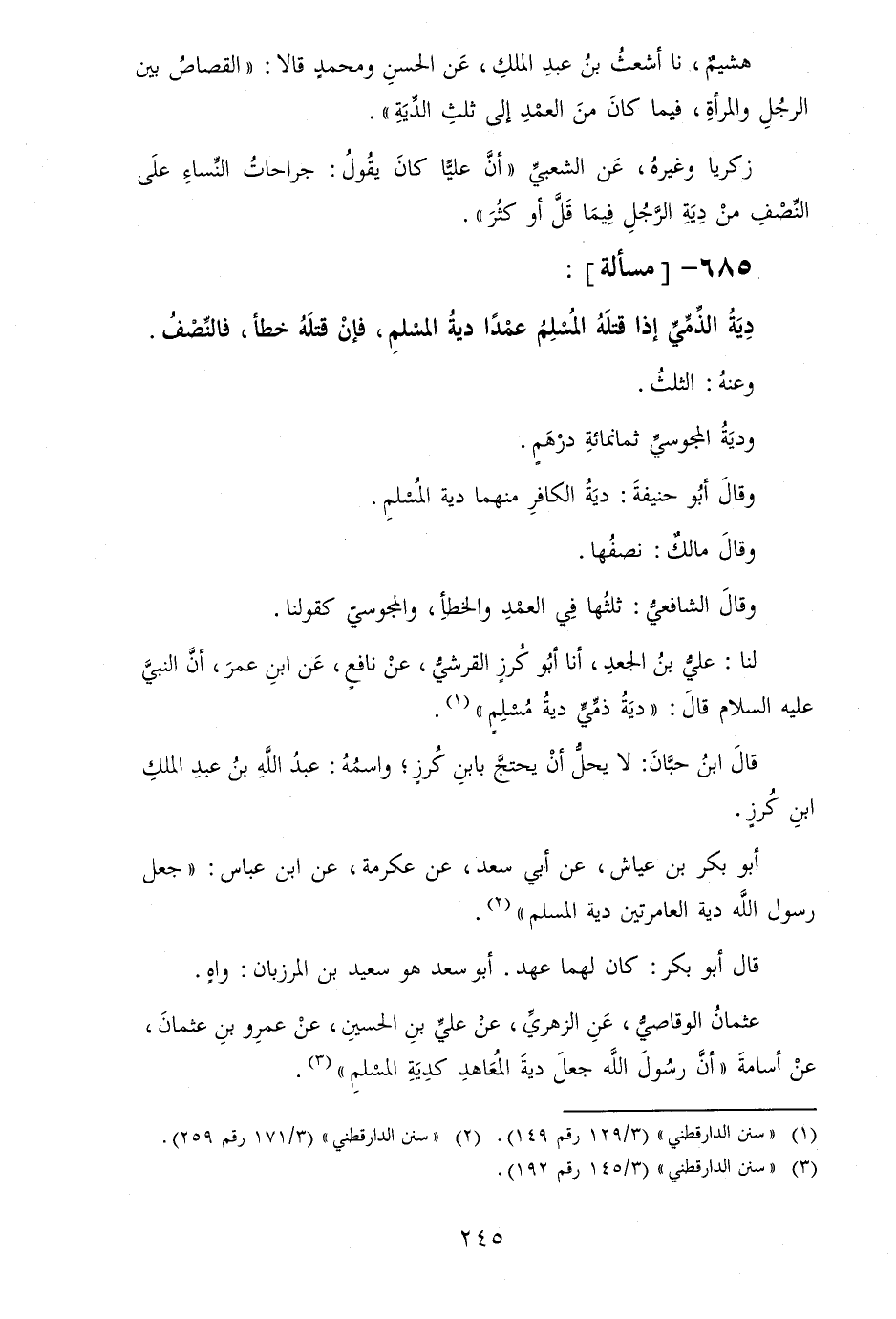 زَكَرِيَّا وَغَيره، عَن الشّعبِيّ " أَن عليا كَانَ يَقُول: جراحات النِّسَاء على النّصْف من دِيَة الرجل فِيمَا قل أَو كثر ".