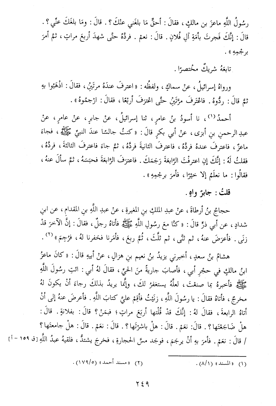 أَحْمد، نَا أسود بن عَامر، ثَنَا إِسْرَائِيل، عَن جَابر، عَن عَامر، عَن عبد الرَّحْمَن بن أَبْزَى، عَن أبي بكر قَالَ: " كنت جَالِسا عِنْد النَّبِي [صلى الله عَلَيْهِ وَسلم] ، فجَاء مَاعِز، فاعترف عِنْده فَرده، فاعترف الثَّانِيَة فَرده، ثمَّ جَاءَ فاعترف الثَّالِثَة، فَرده، فَقلت لَهُ: إِنَّك إِن اعْترفت الرَّابِعَة رجمك. فاعترف الرَّابِعَة فحبسه، ثمَّ سَأَلَ عَنهُ، فَقَالُوا: مَا نعلم إِلَّا خيرا، فَأمر برجمه ".