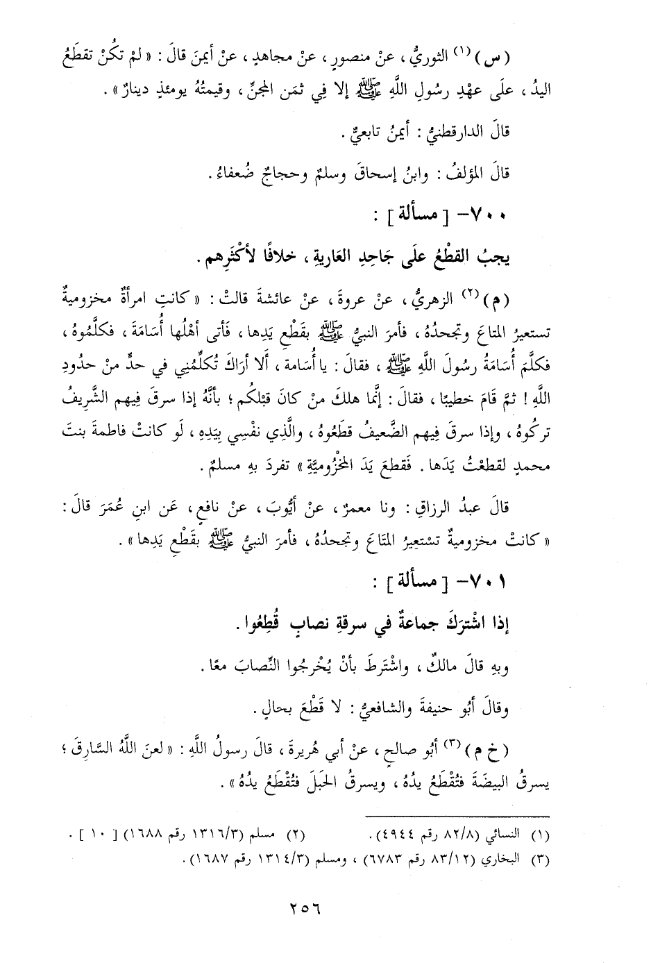 (م) الزُّهْرِيّ، عَن عُرْوَة، عَن عَائِشَة قَالَت: " كَانَت امْرَأَة مخزومية تستعير الْمَتَاع وتجحده، فَأمر النَّبِي [صلى الله عَلَيْهِ وَسلم] بِقطع يَدهَا، فَأتى أَهلهَا أُسَامَة، فكلموه، فَكلم أُسَامَة رَسُول الله [صلى الله عَلَيْهِ وَسلم] ، فَقَالَ: يَا أُسَامَة، أَلا أَرَاك تكلمني فِي حد من حُدُود الله! ثمَّ قَامَ خَطِيبًا، فَقَالَ: إِنَّمَا هلك من كَانَ قبلكُمْ، بِأَنَّهُ إِذا سرق فيهم الشريف تَرَكُوهُ، وَإِذا سرق فيهم الضَّعِيف قطعوه، وَالَّذِي نَفسِي بِيَدِهِ، لَو كَانَت فَاطِمَة بنت مُحَمَّد لَقطعت يَدهَا. فَقطع يَد المخزومية " تفرد بِهِ مُسلم.
