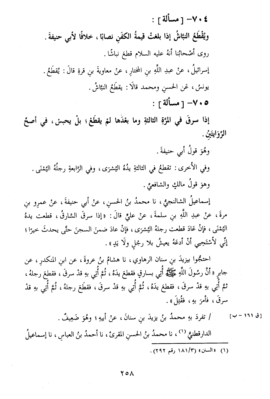 إِسْمَاعِيل الشالنجي، نَا مُحَمَّد بن الْحسن، عَن أبي حنيفَة، عَن عَمْرو بن مرّة، عَن عبد الله بن سَلمَة، عَن عَليّ قَالَ: " إِذا سرق السَّارِق، قطعت يَده الْيُمْنَى، فَإِن عَاد قطعت رجله الْيُسْرَى،، فَإِن عَاد ضمن السجْن حَتَّى يحدث خيرا؛ إِنِّي لأستحيي أَن أَدَعهُ يعِيش بِلَا رجل وَلَا يَد ".