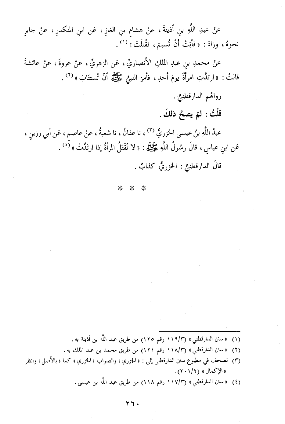 عبد الله بن عِيسَى الخزري، نَا عَفَّان، نَا شُعْبَة، عَن عَاصِم، عَن أبي رزين، عَن ابْن عَبَّاس، قَالَ رَسُول الله [صلى الله عَلَيْهِ وَسلم] : " لَا تقتل الْمَرْأَة إِذا ارْتَدَّت ".