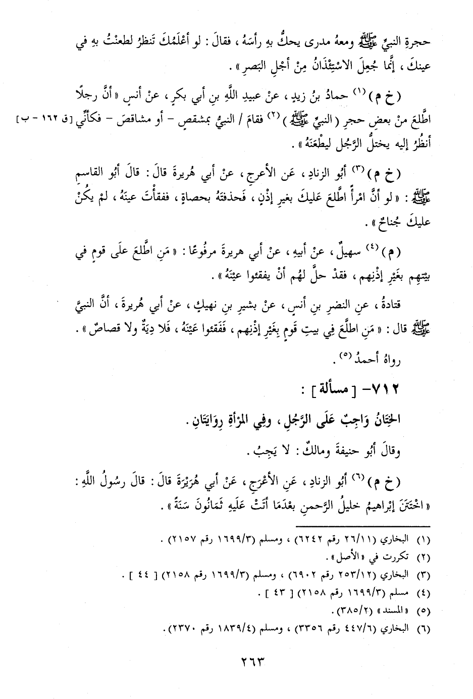 (م) سُهَيْل، عَن أَبِيه، عَن أبي هُرَيْرَة مَرْفُوعا: " من اطلع على قوم فِي بَيتهمْ بِغَيْر إذْنهمْ، فقد حل لَهُم أَن يفقئوا عينه ".