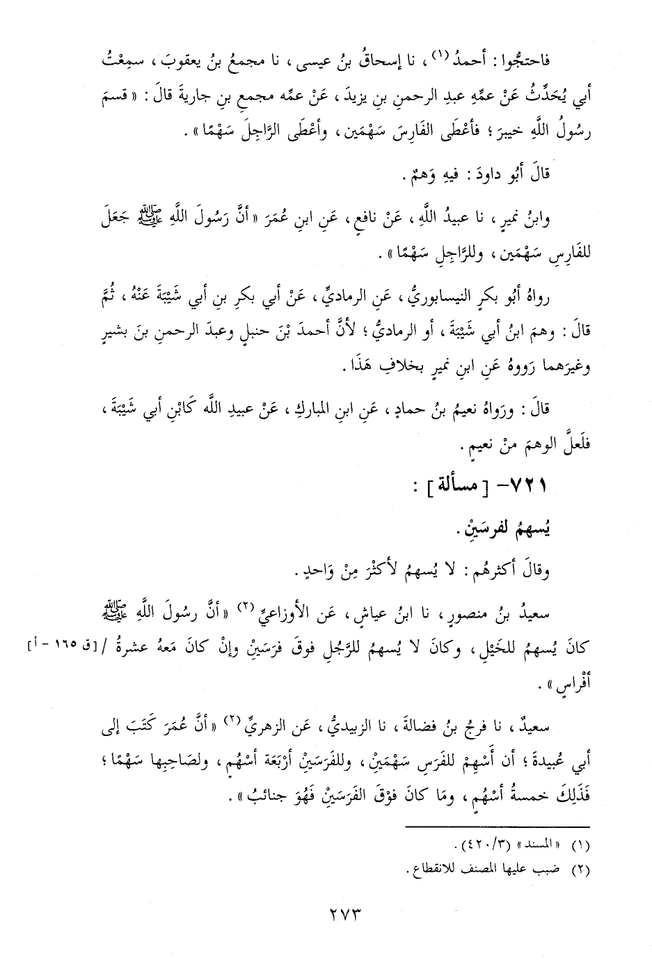 وَابْن نمير، نَا عبيد الله، عَن نَافِع، عَن ابْن عمر " أَن رَسُول الله [صلى الله عَلَيْهِ وَسلم] جعل للفارس سَهْمَيْنِ، وللراجل سَهْما ".