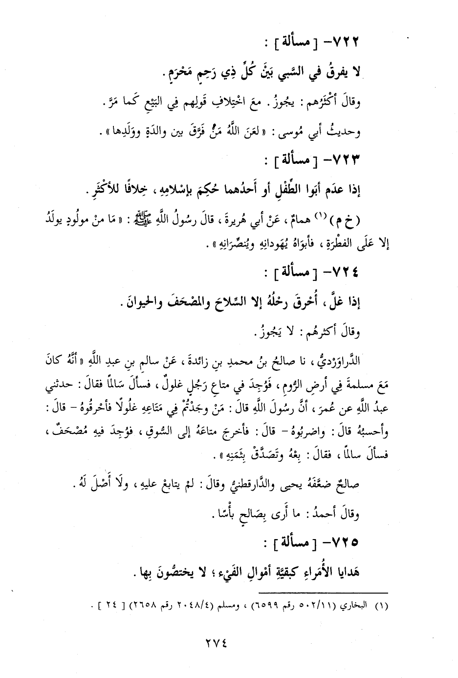 الدَّرَاورْدِي، نَا صَالح بن مُحَمَّد بن زَائِدَة، عَن سَالم بن عبد الله " أَنه كَانَ مَعَ مسلمة فِي أَرض الرّوم، فَوجدَ فِي مَتَاع رجل غلُول، فَسَأَلَ سالما فَقَالَ: حَدثنِي عبد الله عَن عمر، أَن رَسُول الله قَالَ: من وجدْتُم فِي مَتَاعه غلولاً فَأَحْرقُوهُ - قَالَ: وَأَحْسبهُ قَالَ: واضربوه - قَالَ: فَأخْرج مَتَاعه إِلَى السُّوق، فَوجدَ فِيهِ مصحف، فَسَأَلَ سالما، فَقَالَ: بِعْهُ وَتصدق بِثمنِهِ ".