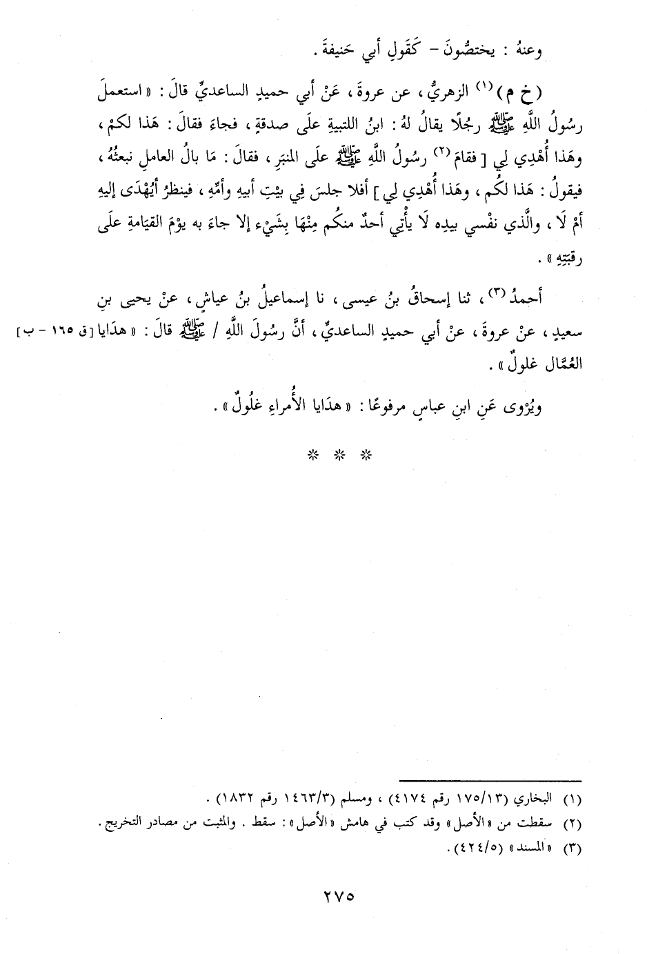أَحْمد، ثَنَا إِسْحَاق بن عِيسَى، نَا إِسْمَاعِيل بن عَيَّاش، عَن يحيى بن سعيد، عَن عُرْوَة، عَن أبي حميد السَّاعِدِيّ، أَن رَسُول الله [ق 165 - ب] / [صلى الله عَلَيْهِ وَسلم] قَالَ: " هَدَايَا الْعمَّال غلُول ".