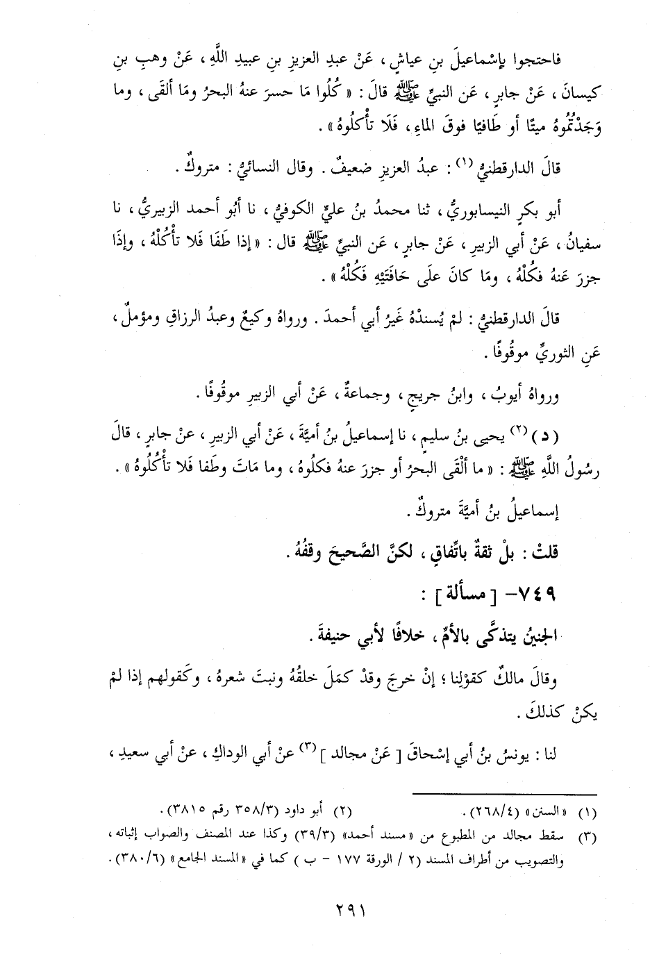 (د) يحيى بن سليم، نَا إِسْمَاعِيل بن أُميَّة، عَن أبي الزبير، عَن جَابر، قَالَ رَسُول الله [صلى الله عَلَيْهِ وَسلم] : " مَا ألْقى الْبَحْر أَو جزر عَنهُ فكلوه، وَمَا مَاتَ وطفا فَلَا تأكلوه ".