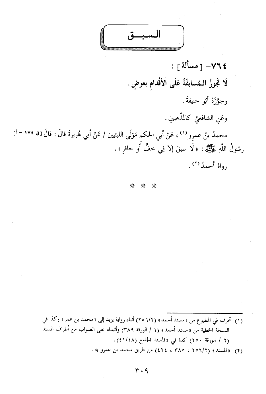 مُحَمَّد بن عَمْرو، عَن أبي الحكم مولى الليثيين [ق 174 - أ] / عَن أبي هُرَيْرَة قَالَ: قَالَ رَسُول الله [صلى الله عَلَيْهِ وَسلم] : " لَا سبق إِلَّا فِي خف أَو حافر ".