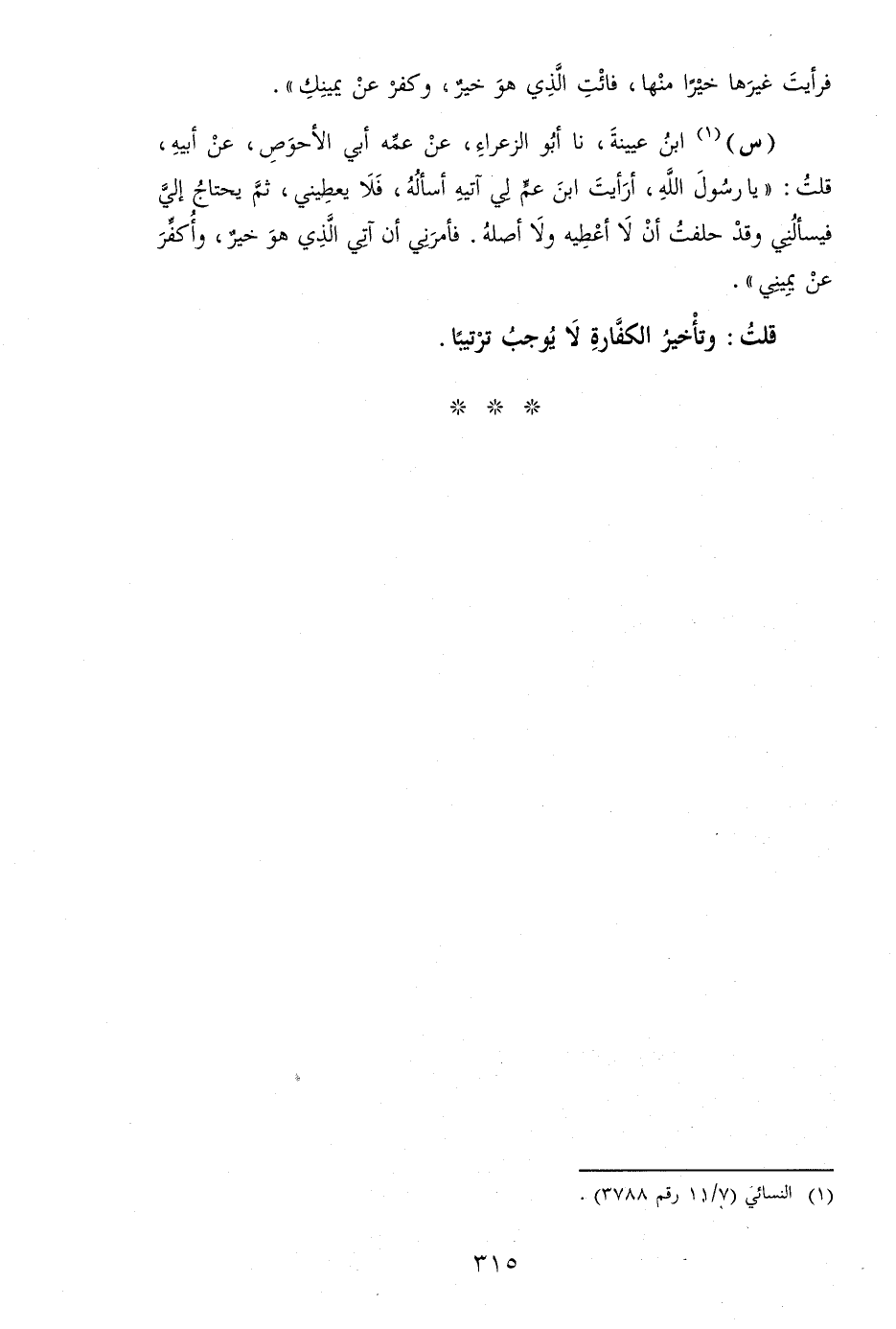 (س) ابْن عُيَيْنَة، نَا أَبُو الزَّعْرَاء، عَن عَمه أبي الْأَحْوَص، عَن أَبِيه، قلت: " يَا رَسُول الله، أَرَأَيْت ابْن عَم لي آتيه أسأله، فَلَا يعيطيني، ثمَّ يحْتَاج إِلَيّ فيسألني وَقد حَلَفت أَن لَا أعْطِيه وَلَا أَصله. فَأمرنِي ان آتِي الَّذِي هُوَ خير، وأكفر عَن يَمِيني ".