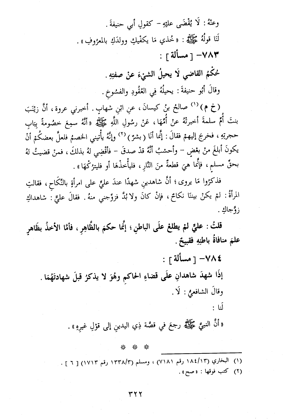 (خَ م) صَالح بن كيسَان، عَن ابْن شهَاب. أَخْبرنِي عُرْوَة، أَن زَيْنَب بنت أم سَلمَة أخْبرته عَن أمهَا، عَن رَسُول الله [صلى الله عَلَيْهِ وَسلم] " أَنه سمع خُصُومَة بِبَاب حجرته، فَخرج إِلَيْهِم فَقَالَ: إِنَّمَا أَنا (بشر) وَإنَّهُ يأتيني الْخصم فَلَعَلَّ بَعْضكُم أَن يكون أبلغ من بعض - وأحسب أَنه قد صدق - فأقضي لَهُ بذلك، فَمن قضيت لَهُ بِحَق مُسلم، فَإِنَّمَا هِيَ قِطْعَة من النَّار، فليأخذها أَو فليتركها ".
